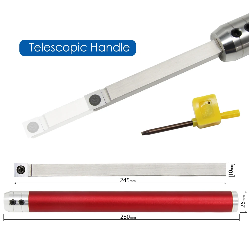 -Материал лезвия: Карбид вольфрама -Материал беседки: нержавеющая сталь -Материал ручки: алюминиевый сплав -Твердость лезвия: HRC 90 -Длина беседки: 245 мм -Диаметр беседки: 10 мм -Длина ручки: 280 мм -Диаметр ручки: 26 мм -Цвет ручки: красный -Максимальная длина: 20 "телескопические инструменты для токарной обработки древесины