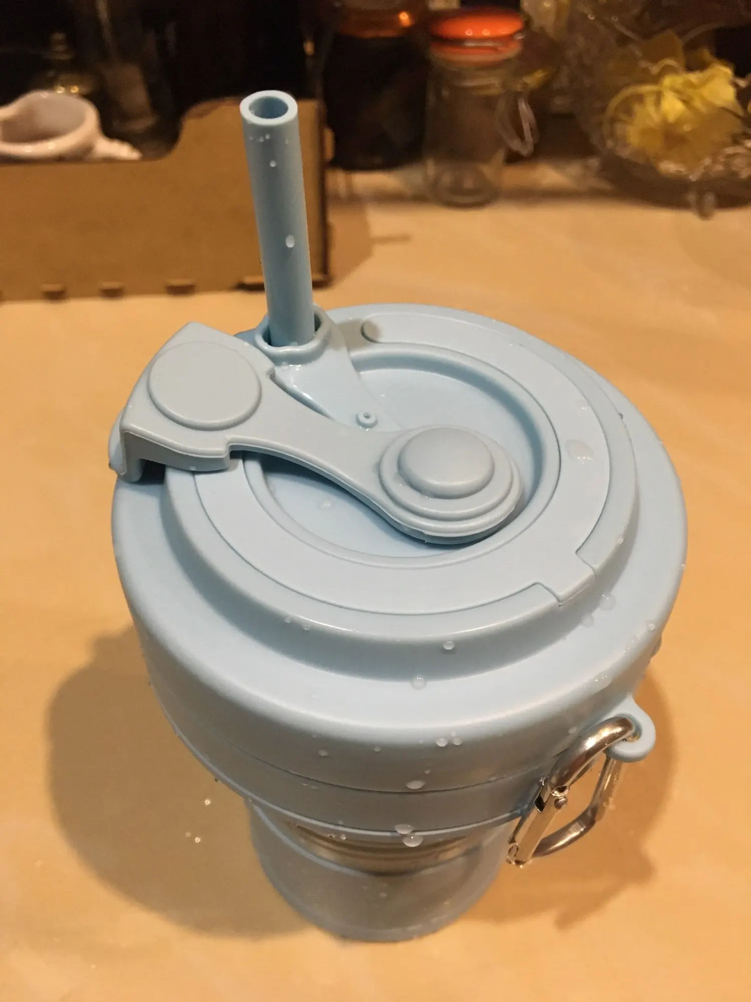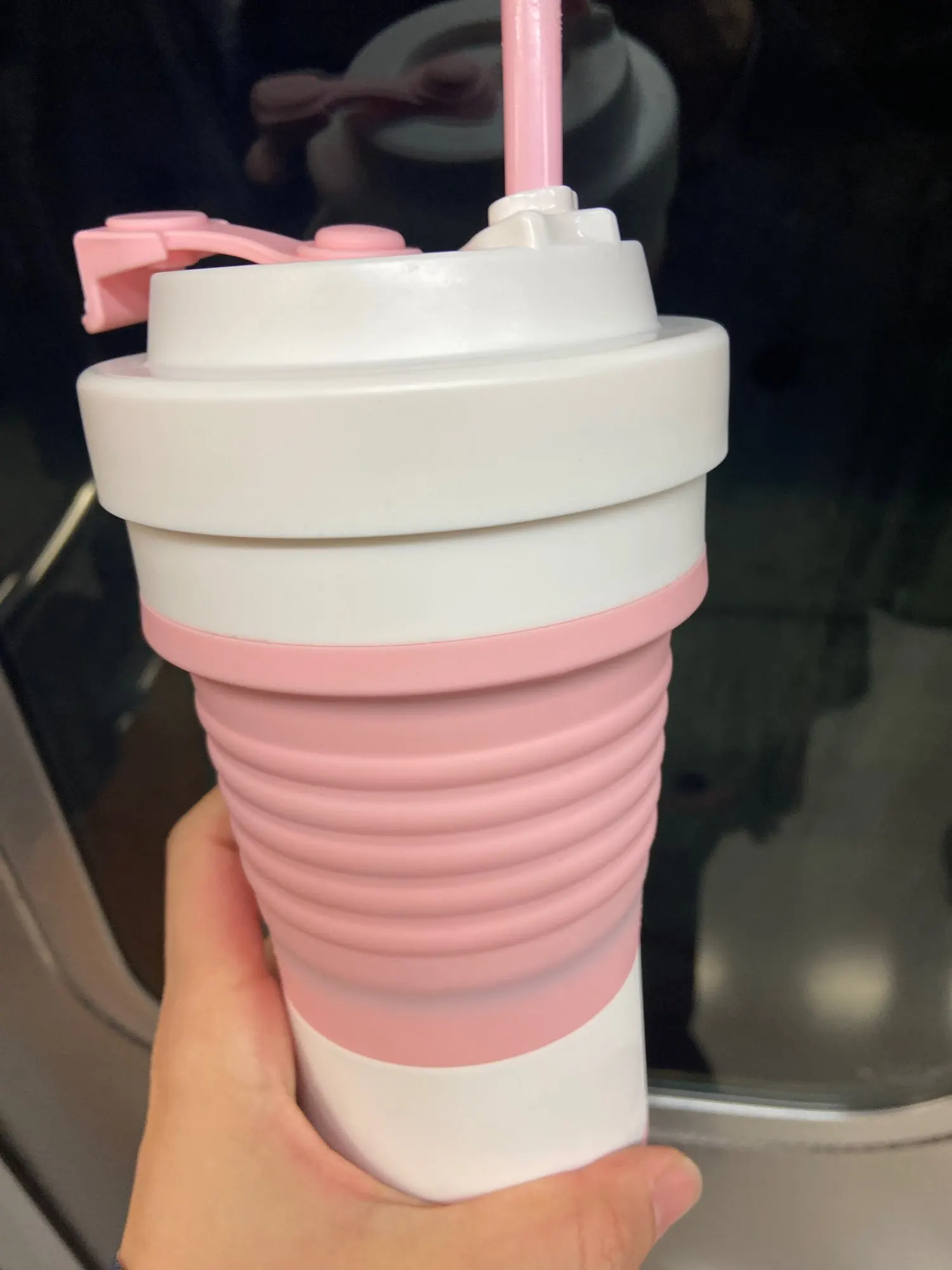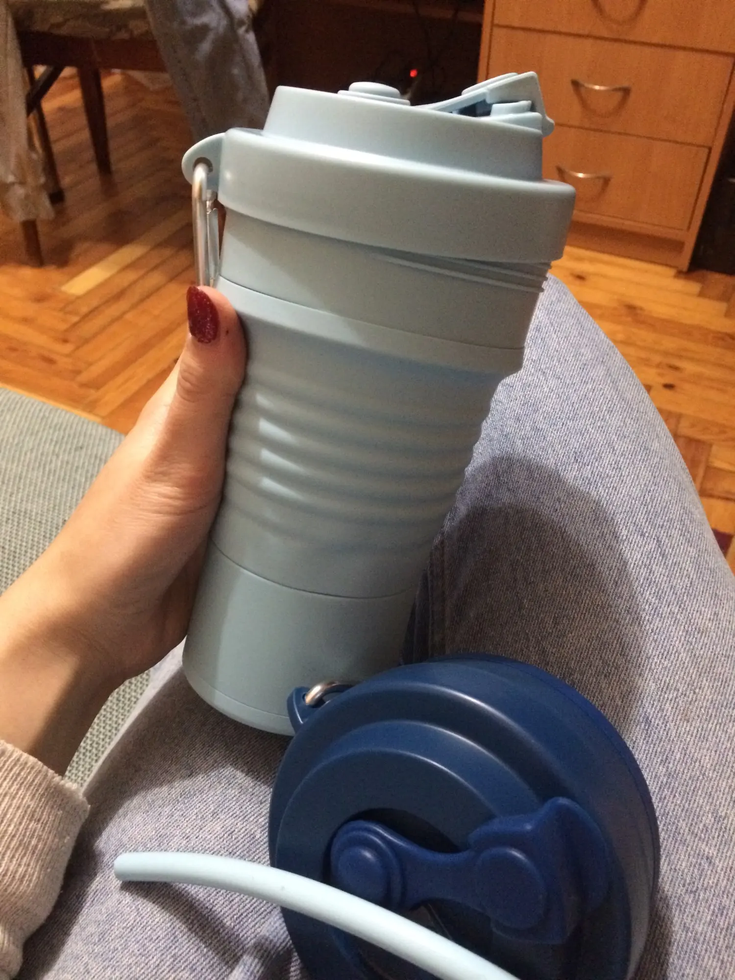 Складная Силиконовая кружка пришла в постамат за 11 дней. На таможне даже объединили 2 посылки от другого продавца - что очень удобно. Размер кружки 10х15см в разложенном виде, 10х7см в сложенном. Объём 550мл. Она достаточно большая в жизни, чем кажется на фото, я бы наверно, взяла бы поменьше. Выдерживает температуры от -40 до +200, так что как только она приехала, сразу же помыла ее в посудомоечной машине. Кружка имеет силиконовую трубочку, которую можно свернуть и спрятать во внутрь и металлический карабин. Отверстие герметично и не проливается. Очень качественный продукт за свою цену. Рекомендую