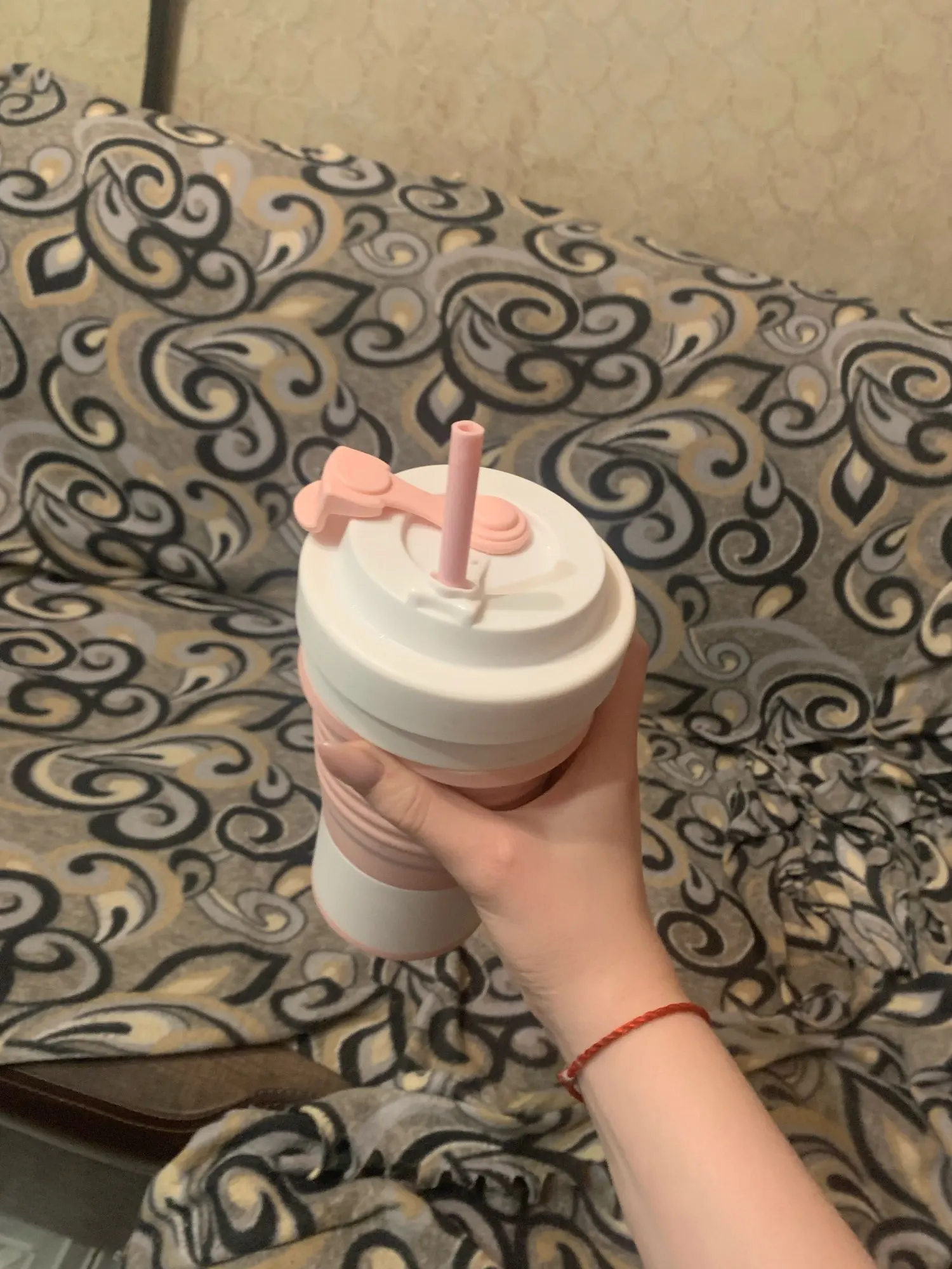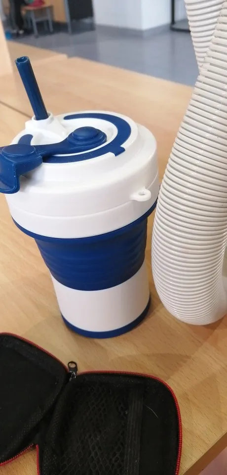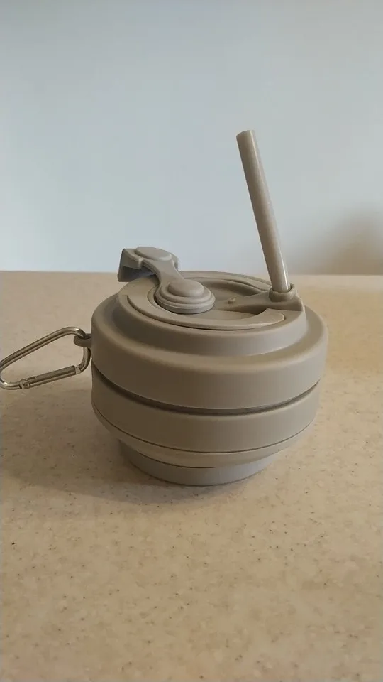 кружка пришла за 2 недели. описанию соответствует. запах небольшой был. была вложена инструкция, как избавиться от запаха: прокипятить 5 минут и 2 часа продержать внутри горячий зелёный чай. в итоге сейчас пахнет только чаем. у меня не получилось сложить кружку как в видео заворачивая, просто складываю. когда кипяток внутри, кружка нагревается и даже за пластмассовую часть держать не очень комфортно, но возможно. холодная жидкость не выливается. материал тактильно приятный. трубочка внутри была.