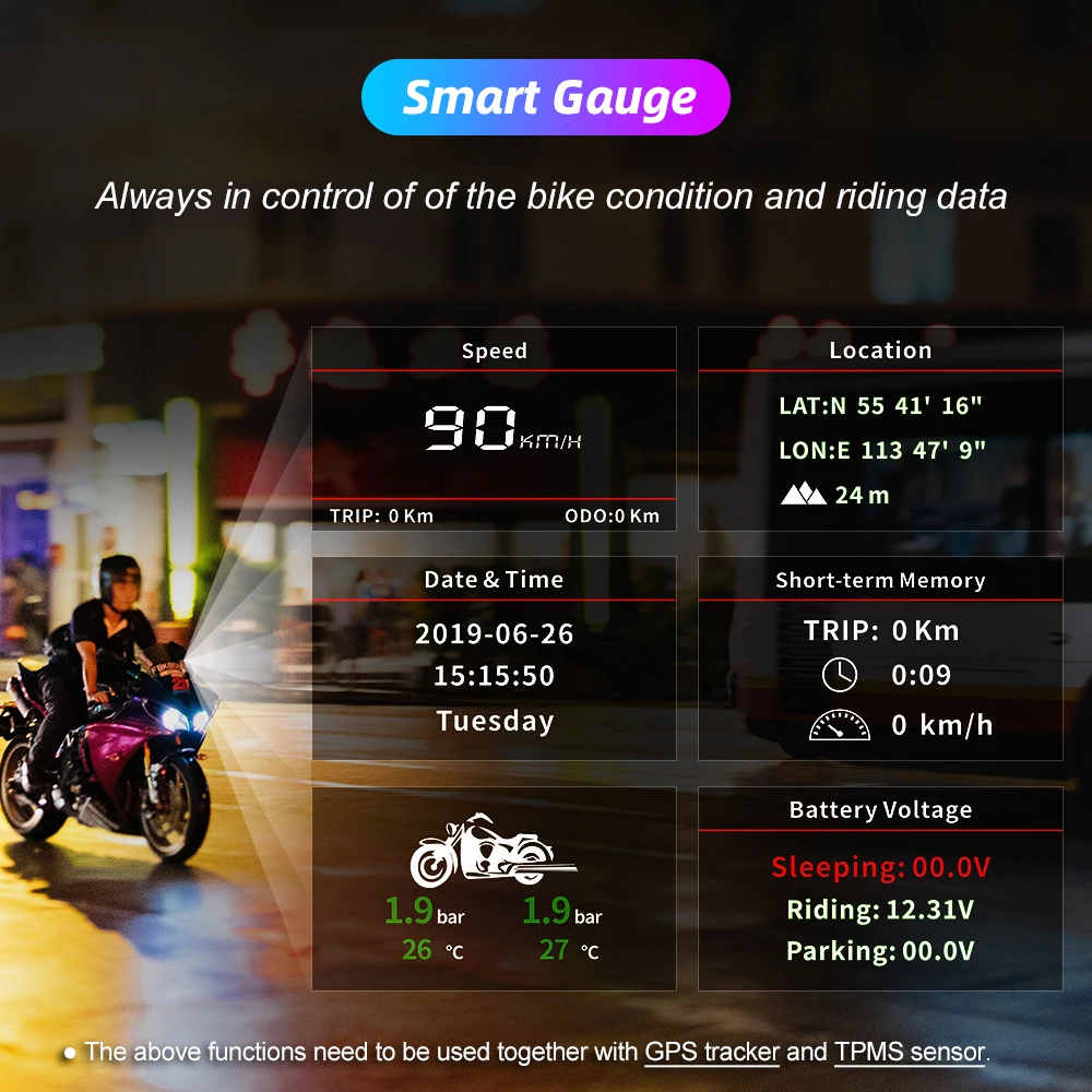 Режим Smart Gauge обеспечивает понимание скорости, местоположения, высоты, одного времени вождения и пробега (расстояние поездки) при подключении к выделенному gps-трекеру. Кроме того, он может также контролировать и отображать давление и температуру в шинах в сочетании с дополнительными совместимыми датчиками.● Функция контроля давления и температуры в шинах доступна только при выборе опции с TPMS.● Вы также можете приобрести датчик TPMS отдельно немного позже, чтобы разблокировать функцию контроля давления в шинах и температуры.