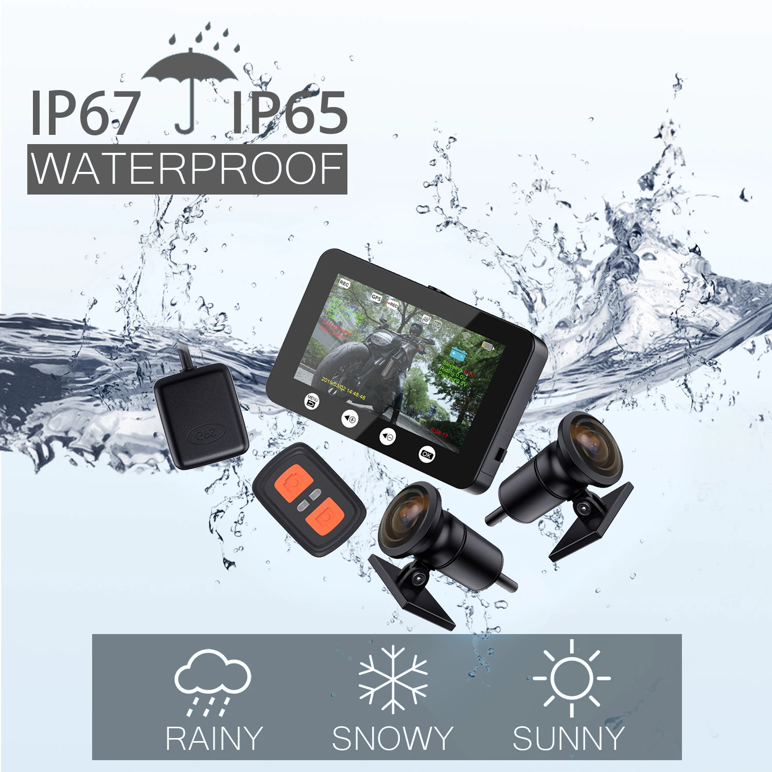IP67 водонепроницаемый дизайн для камер; IP65 водонепроницаемый дизайн для основного блока и других аксессуаров. Будь то дождливая или пыльная, она работает стабильно, записывая каждый момент вашего путешествия.