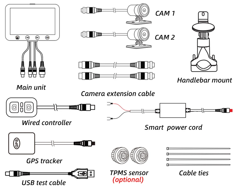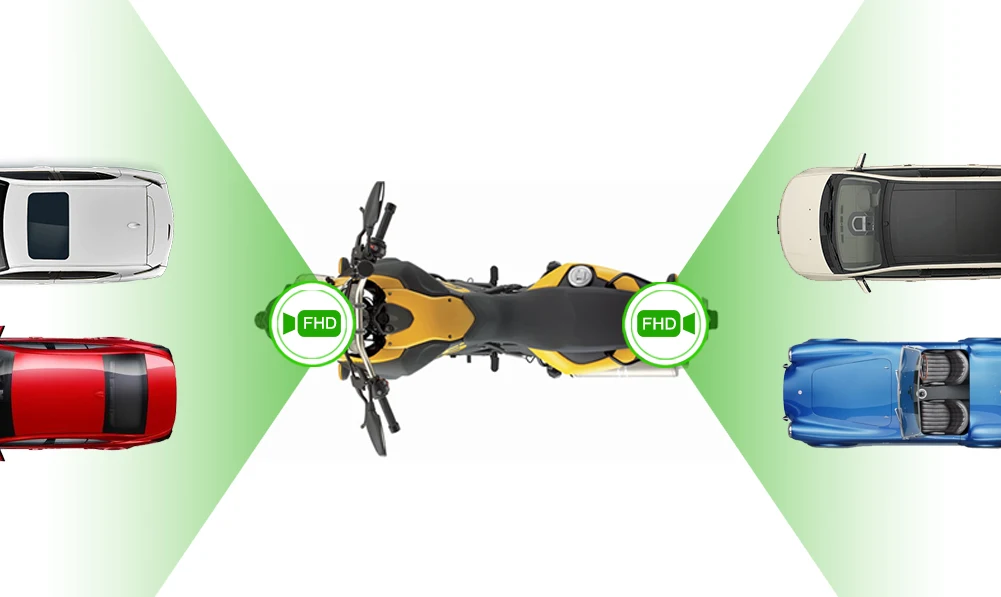 2 канальный отдельно камеры с каждым стандартный 2,0 м кабель-удлинитель для переднего и заднего вида запись. Один на передней и один на задней части вашего велосипеда, который будет записывать все, что происходит перед вами и позади вас в любое время. Идеально подходит для мотоциклов, скутеров, автомобилей, UTV, ATV и любых других транспортных средств.
