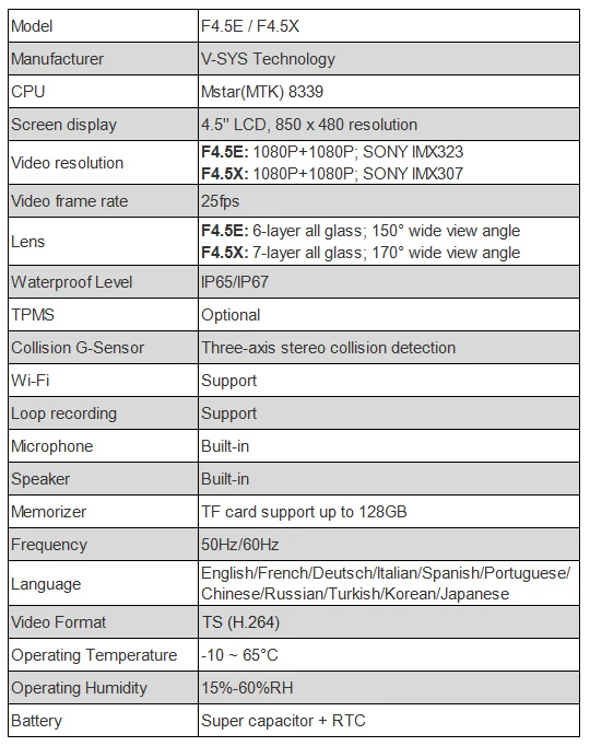 VSYS F4.5X оснащен CPU Mstar 8339, который записывает 25 кадров в секунду в разрешении 1920x1080. Встроенный Sony IMX307 cmos-датчика изображения и 7-стеклянная линза обеспечивает четкие, гладкой и широкий отснятого видеоматериала. Значительно повышает ночное видение на низкой светильник окружающей среды, что делает вашу машину более безопасной в ночное время.● F4.5E имеет 6-слой стеклянного объектива и SONY IMX323 КМОП-матрица.