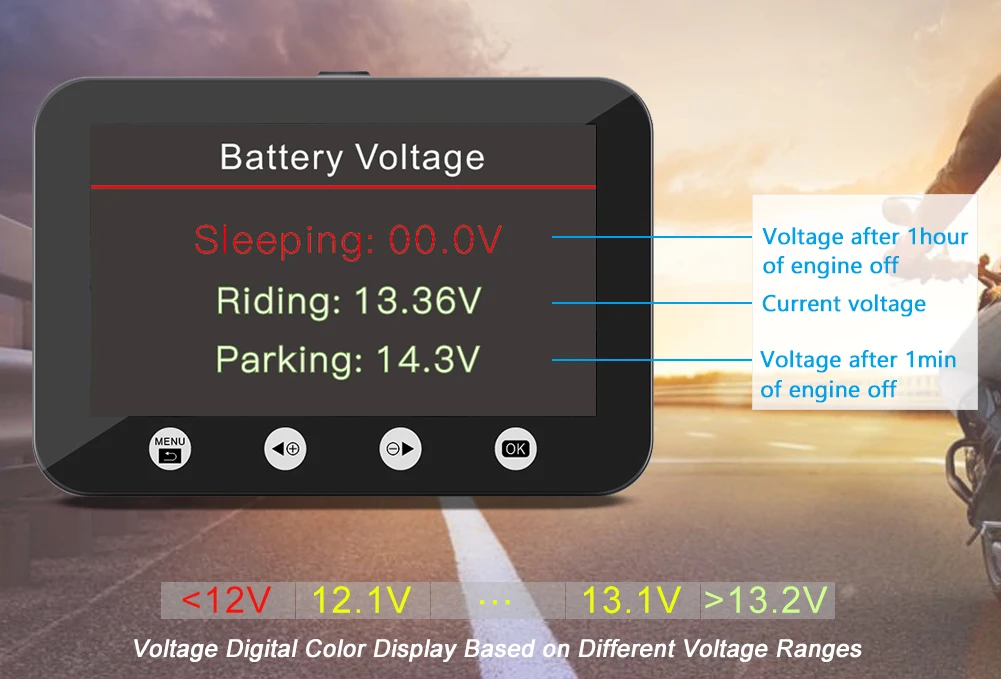 Вольтметр функция имеет легко читаемый на 4,5 ''на большом экране. В основном используется для контроля напряжения аккумулятора, своевременное понимание состояния аккумулятора и электрической системы вашего автомобиля в режиме реального времени, продлевает срок службы батареи, чтобы предотвратить аварии, вызванные проблемами батареи.ФлуоресцентныйНапряжение <12 В → цифровое красное напряжение13,2> Напряжение> 12 в → желтый цифровойНапряжение> 13,2 V → зеленый Напряжение цифровой