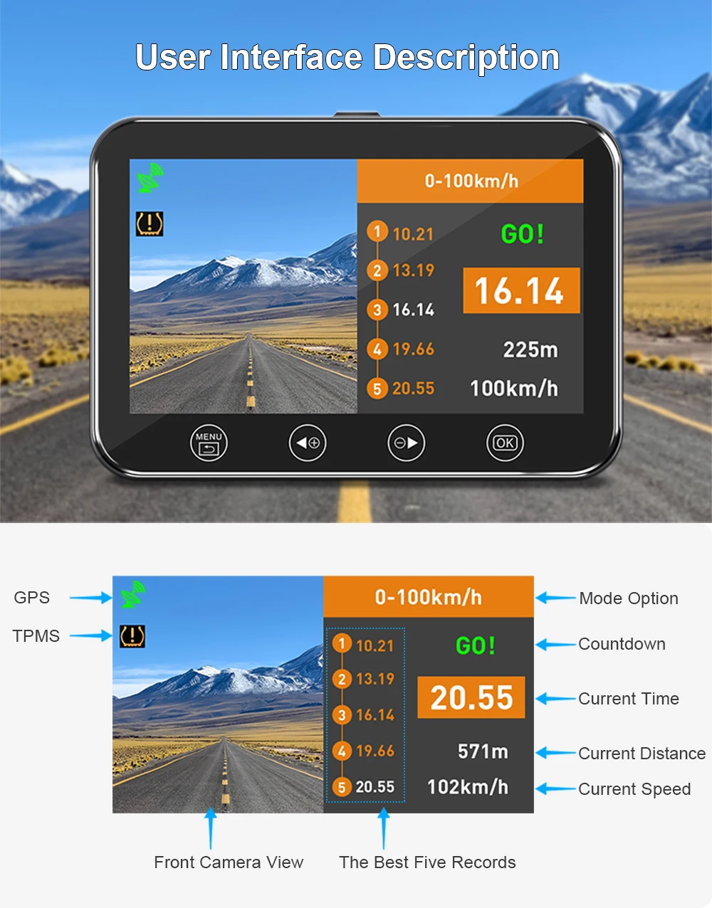 Реалистичный режим Драг гонок, встроенный F4.5 DVR!Гонки в режиме ''0-100 KMPH Acceleration Test '', режиме ''400M Time Trail'' и режиме '600m Time Trail'' с друзьями и членами клуба!С высокочувствительным gps-трекером скорость в реальном времени, расстояние и время будут точно записаны в видеорегистраторе. Это позволяет легко проверить показатель гонки на 4,5-дюймовый экран с разрешением HD (обеспечивает до 5 комплектов из справочной информации).Затачивайте свои навыки и станьте лучшим водителем в своем классе!