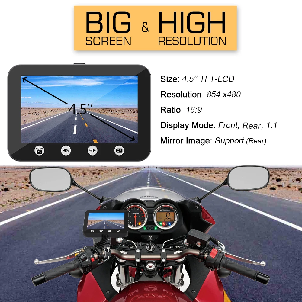 Видеорегистраторы VSYS 2CH разработаны специально для мотоциклов. Предназначено для упрощения использования камер, для безопасности и удовольствия.В F4.5 представляет собой 2-х канальный full HD мотоциклетные видеорегистратор с 4,5 ''большой экран. Вы можете легко установить монитор на руле, чтобы проверить заднего вида вашего велосипеда в режиме реального времени на изображении зеркала (обратное изображение) дисплей.Функция smart gauge также позволяет отслеживать скорость, местоположение, высоту, расстояние поездки, ODO, напряжение батареи, давление в шинах и температуру (опционально) в сочетании с совместимыми датчиками.