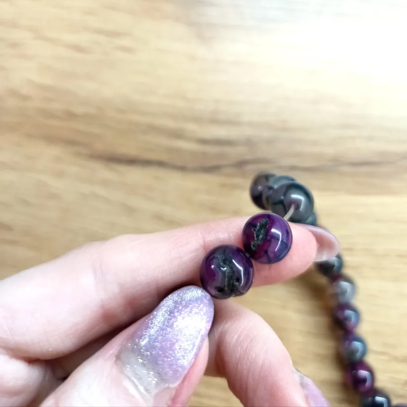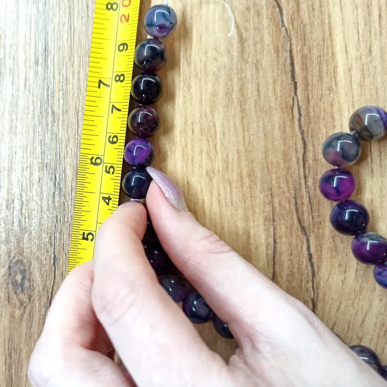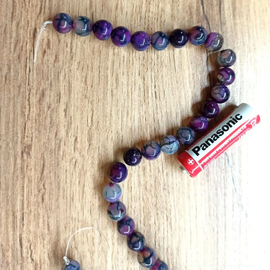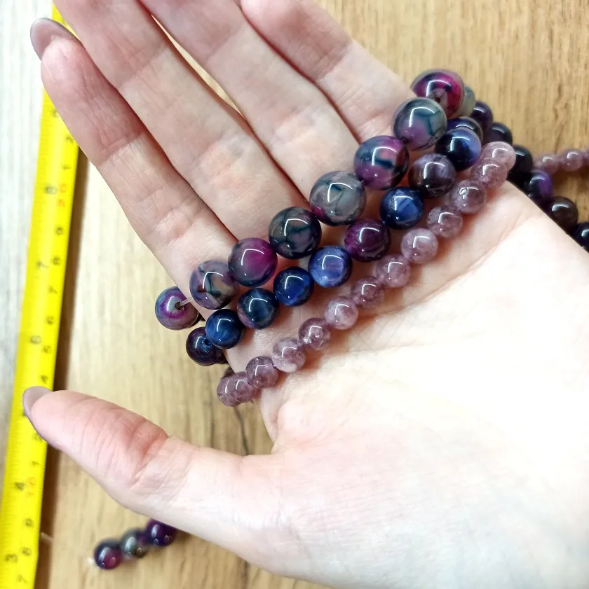 Цвет бусин более-менее соответствует фото продавца, но много темно - фиолетовых. Размер бусин 10 мм, длина нити 38 см. Несколько бусин не соответствуют диаметру 10 мм. Около пяти бусин с браком - они имеют скол. Доставка почти 2 месяца, продавец отправил заказ быстро. На фото я показала сравнение размеров бусин - 6 мм, 8 мм и 10 мм.