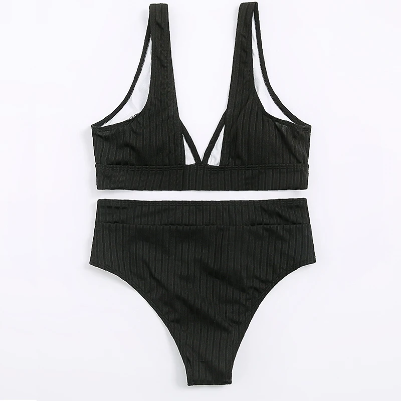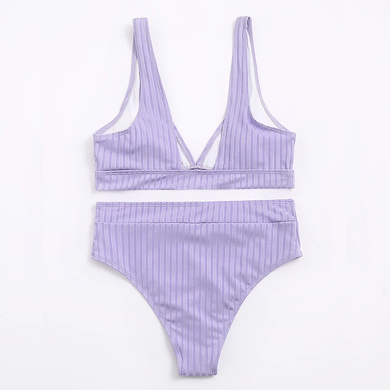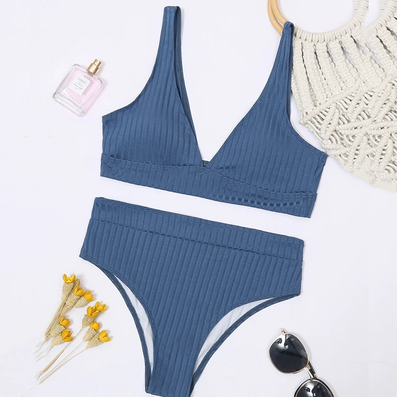 Новый женский купальный костюм с V-образным вырезом, бикини с высокой талией 2020, женская одежда для плавания, комплект бикини из двух предметов, купальник в рубчик с высоким вырезом