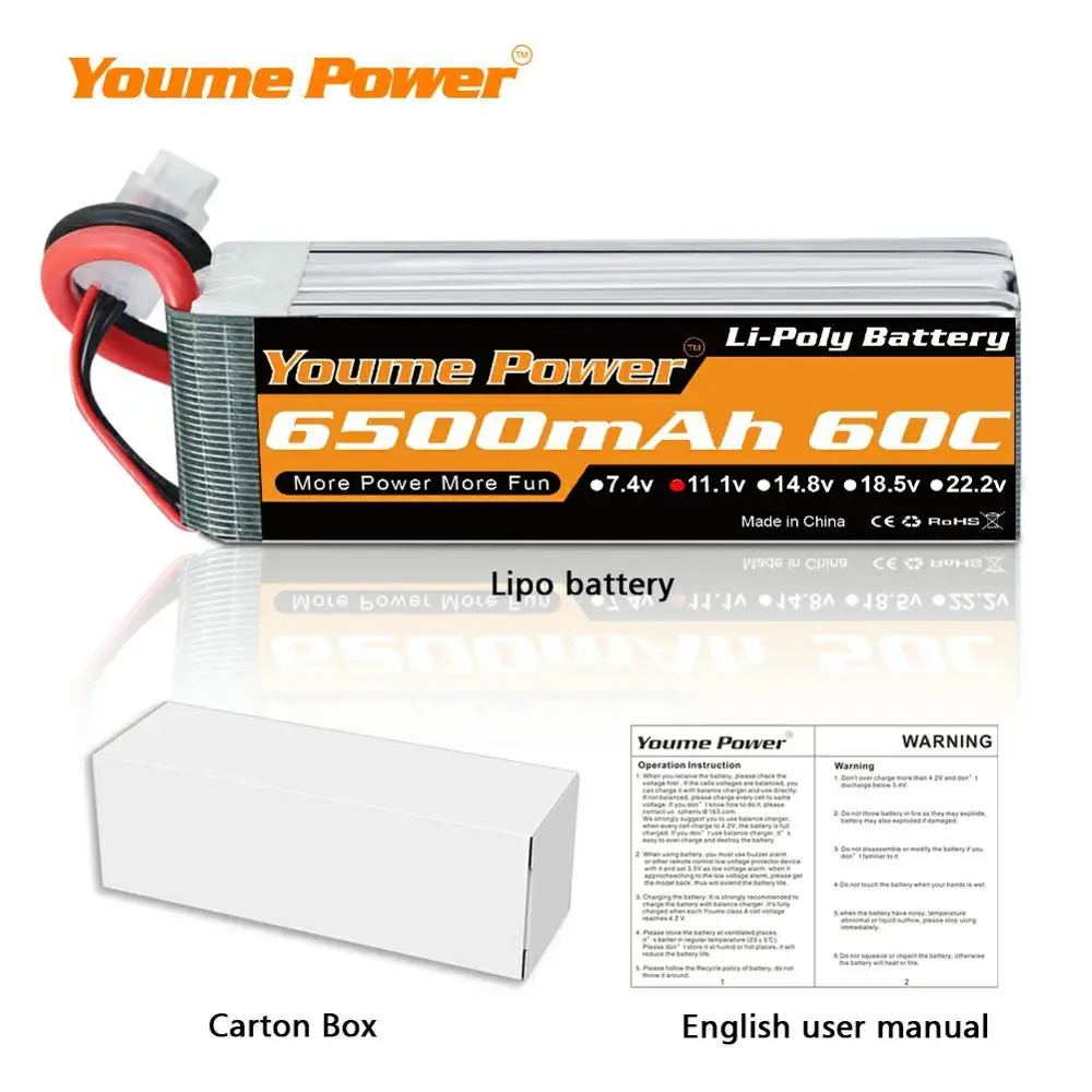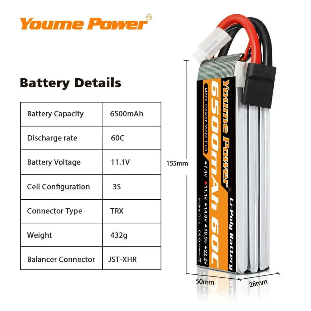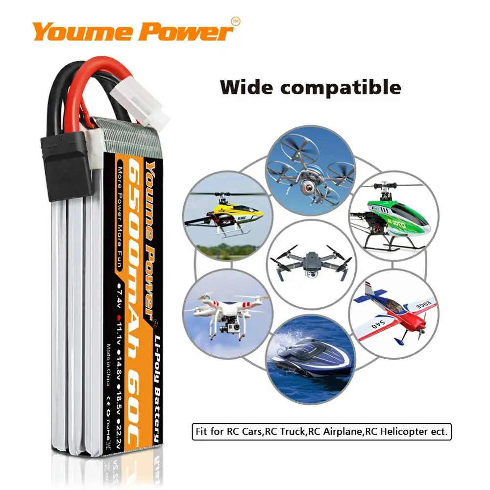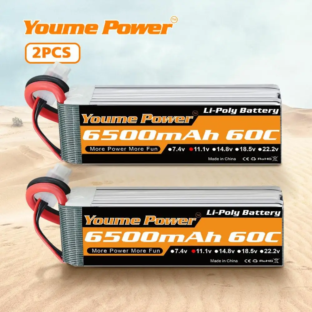 Литий-полимерный аккумулятор Youme 3S, 2 шт., 6500 мАч, 60C, с conenctor trex Deans для traxxa 110 112, Радиоуправляемый автомобиль, монстры, грузовик, гоночный самолет, лодка