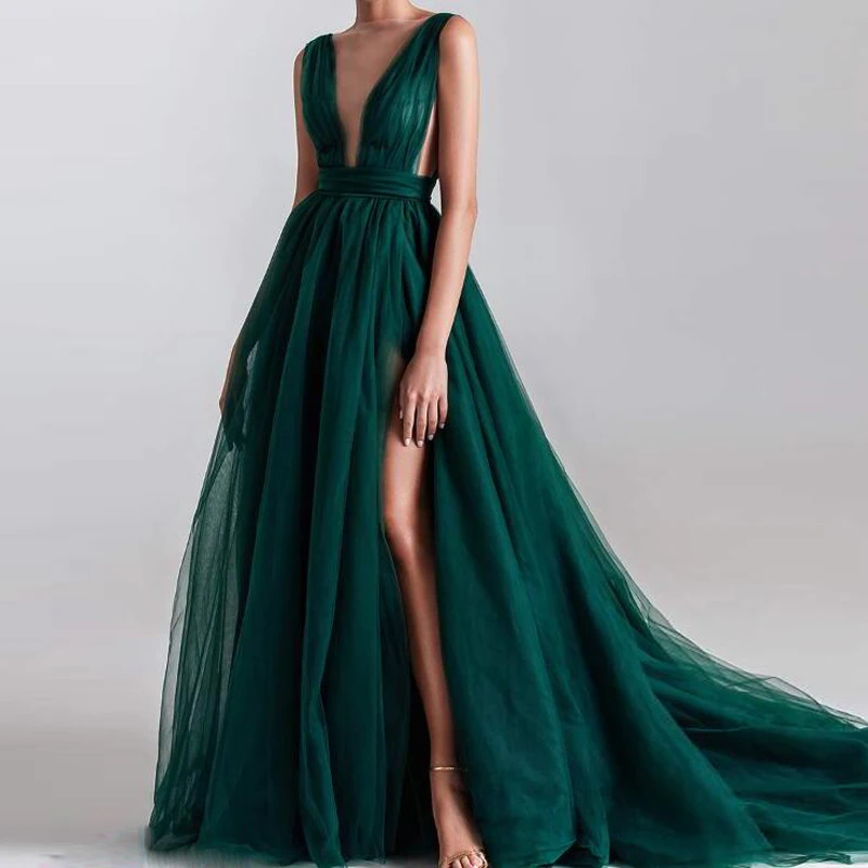 Женское Тюлевое платье, длинное вечернее платье изумрудно-зеленого цвета, с разрезом сбоку, с глубоким V-образным вырезом, 2020