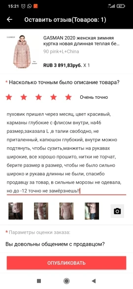Это однозначно, один из самых лучших продавцов на Алиэкспресс! Заказала подряд 2 куртки 1 - прислали худи флисовый и два шарфа, 2 купона на 3 $ в подарок. Но продавец даже не поэтому лучший, а потому что товар у него однозначно высокого качества, и по обзорам удобно было выбирать. Все идеально подошло. Обе куртки. На рост 152, 84-64-95 обе куртки сели, как влитые. Будто по мне шили. Мистика. Не обижала. Всегда что-нибудь не так. А здесь - все идеально. Рукава идеально. На рукавах резинки. Фурнитура упакована вся, и видно, что качество отличное. Спасибо, ребята. Жду третий пуховик! Теперь пуховики заказываем только у Вас! Успехов вам и процветания! Вы - супер!