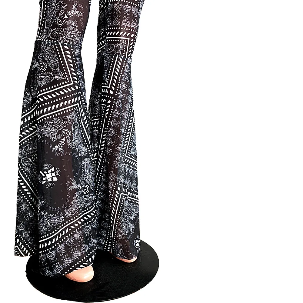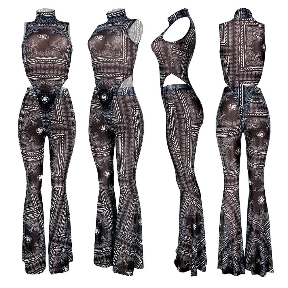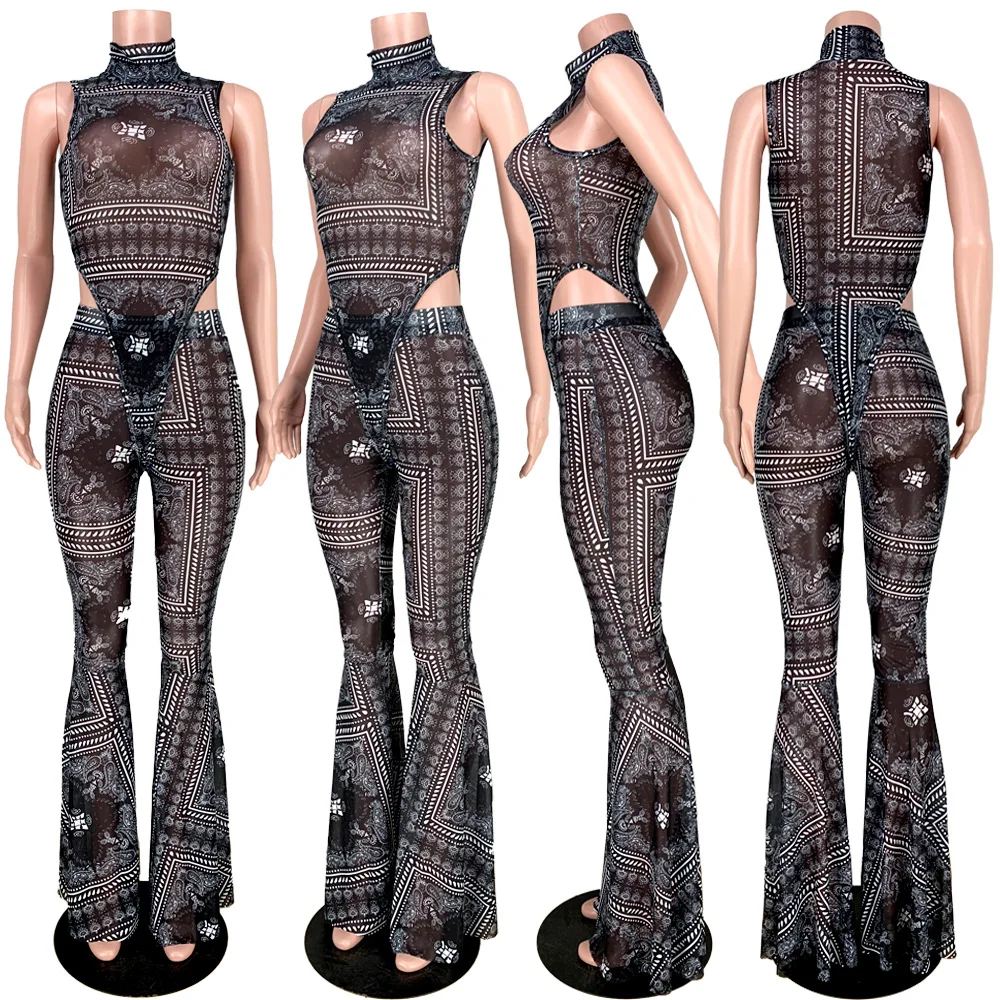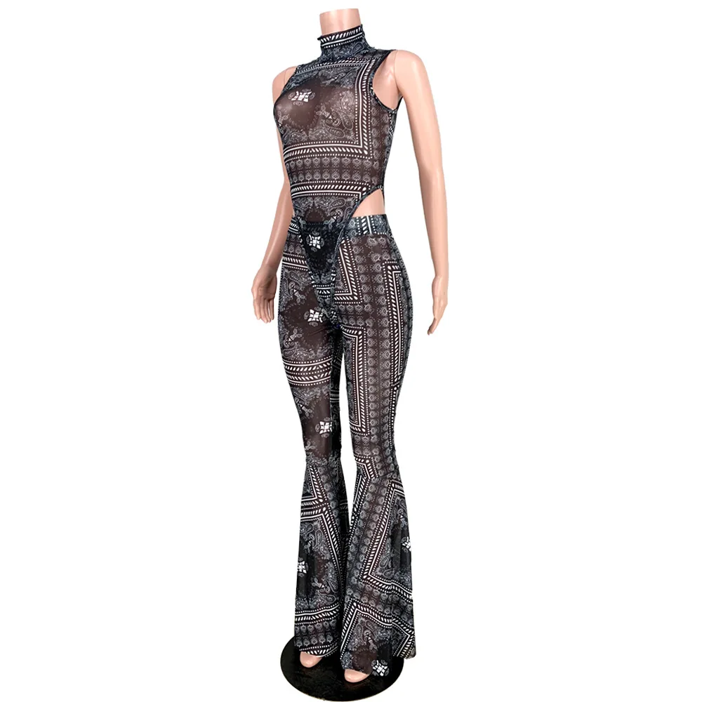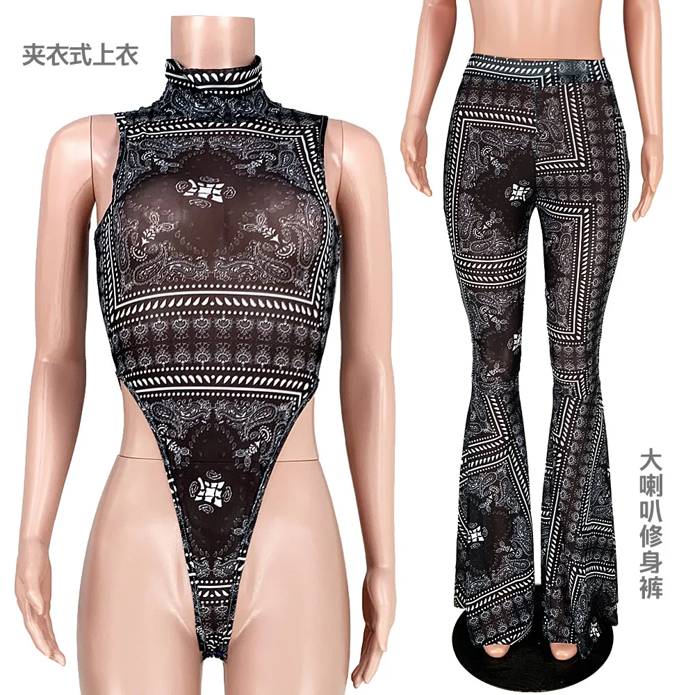 Женский комплект из двух предметов с принтом бандана, сетчатый боди с высоким воротником и расклешенными штанами, сексуальвечерние ный костюм, комплект для фитнеса