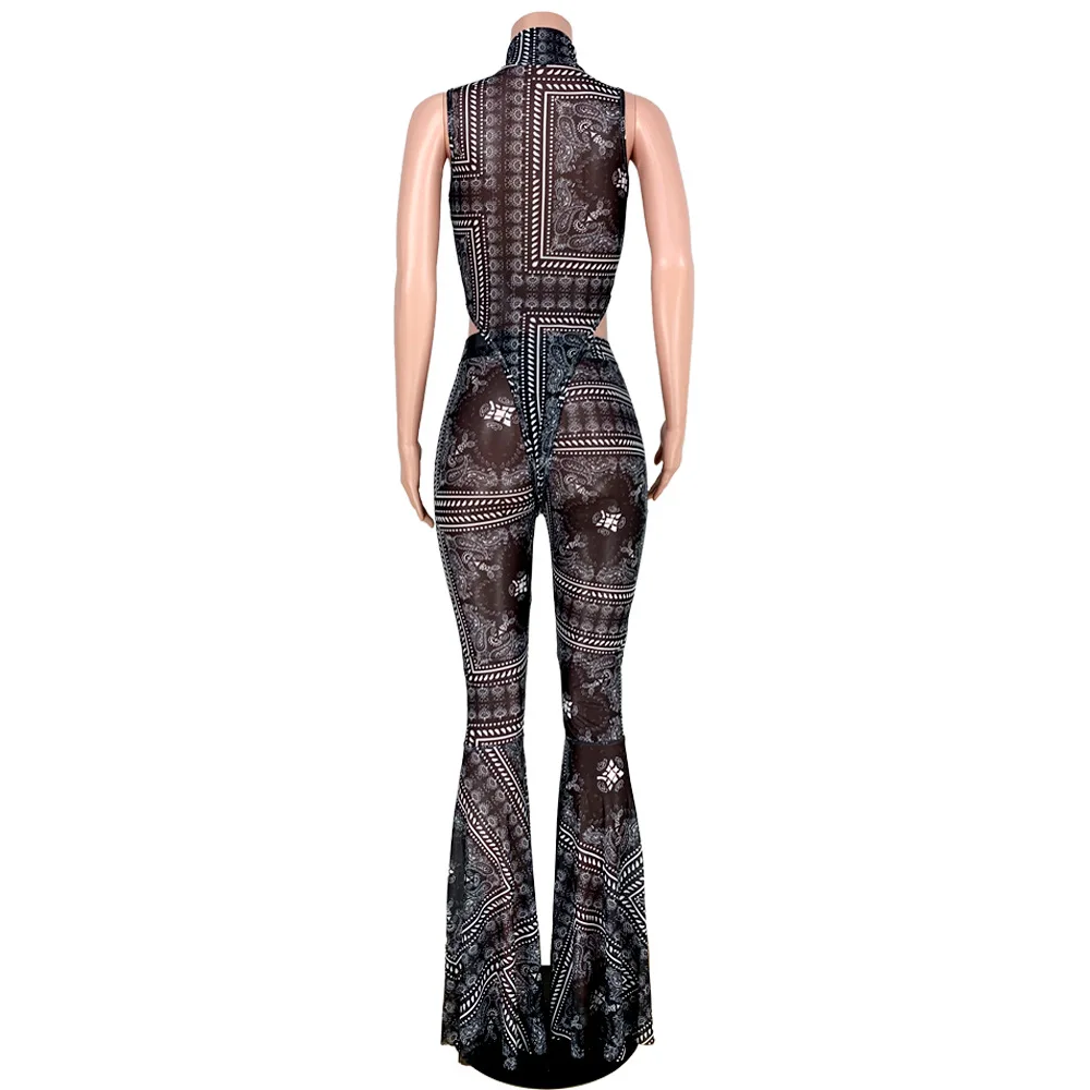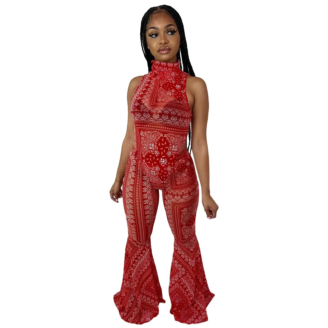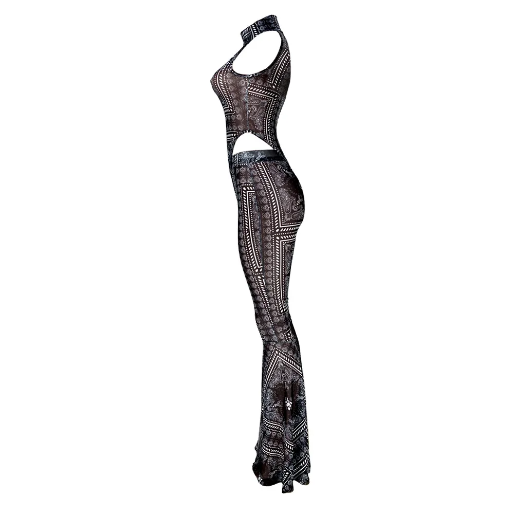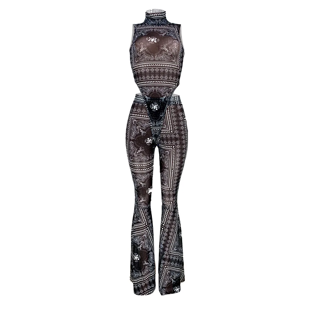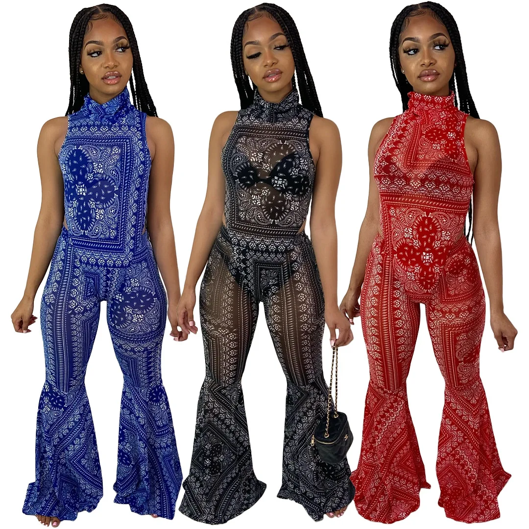 Женский комплект из двух предметов с принтом бандана, сетчатый боди с высоким воротником и расклешенными штанами, сексуальвечерние ный костюм, комплект для фитнеса