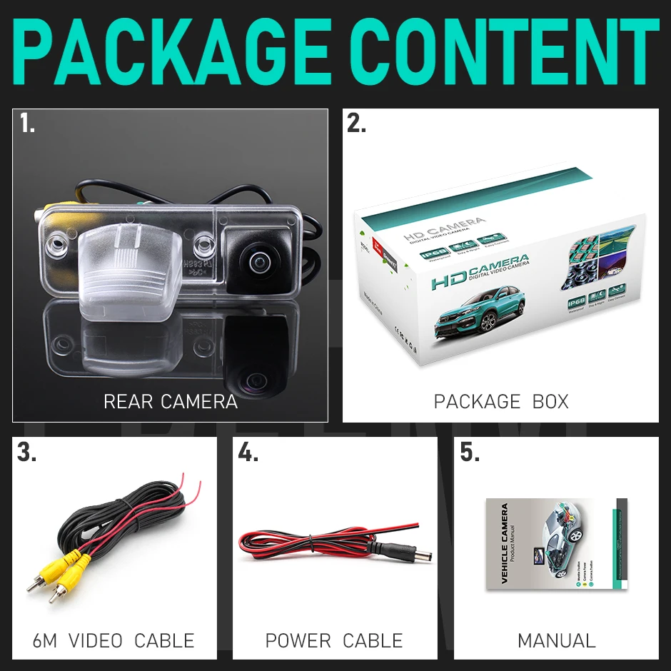 1. Задняя камера2. Коробка для посылка3. Видео кабель (6 м)4. Кабель питания5. Руководство пользователя