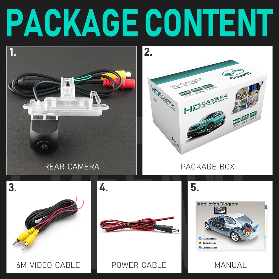 1. Задняя камера2. Коробка для посылка3. Видео кабель (6 м)4. Кабель питания5. Руководство пользователя