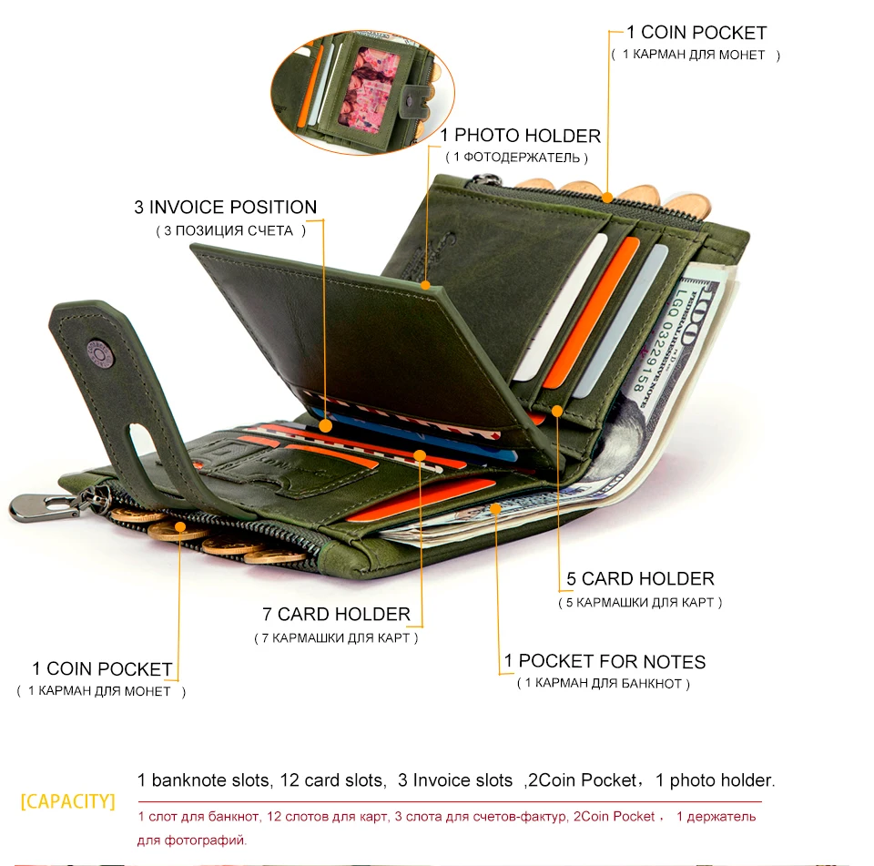 Capacitydouble zipper pocket, photo holder, card slot, bill slot