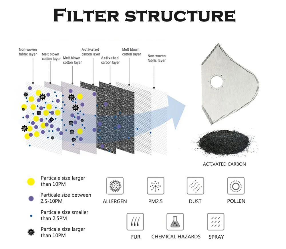 Маска с активированным углем для лица, Пылезащитная, Пылезащитная, с 2 клапанами и 2 фильтрами