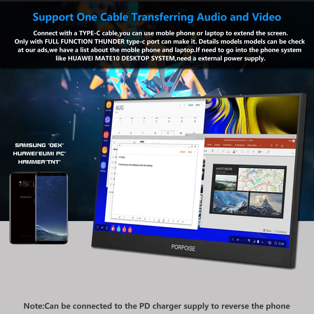 Вопрос: это нормально для одного типа C для кабеля TYPE C для подключения моего macbook и Samsung S8 +?О: Да, только один кабель подключен и может работать, не нужно зарядное устройство. Если требуется питание от macbook или мобильный телефон, можно использовать зарядное устройство PD для зарядки порта PD type c на мониторе. Затем он может перезарядить ваш macbook или S8 +. В: В чем разница между зарядным устройством 3.0 и зарядным устройством PD?A: обычное 5V-3A, 9V-2A,12V-1.5 многофункциональное зарядное устройство, только для поддержки монитора светильник. В то время как зарядное устройство PD может заряжать мобильный телефон или ноутбук. В: Поддерживает ли он какой-либо мобильный телефон с помощью TYPE-C?О: порт PORPOISE поддерживает только sup порт Thunder Type-C порт Мобильный телефон с помощью кабеля TYPE-C. В: поддерживает ли он любой ноутбук через TYPE-C?О: портативный монитор PORPOISE поддерживает только ноутбук Thunder TYPE-C с помощью TYPE-C-кабеля.В противном случае его необходимо подключить через кабель HDMI на ноутбуке. В: Как использовать его для подключения выключателя?A: сначала снимите контроллер переключателя, затем используйте кабель TYPE-C для подключения экрана переключателя,В то же время используйте зарядное устройство для подключения монитора через кабель USB-Type C. В: какая гарантия на монитор?О: PORPOISE предлагает нашим покупателям 7 дней без причины возврата, 15 дней без причины обмена, 1 год гарантии.В то время как любые Искусственные повреждения не будут пользоваться бесплатной гарантией. В: Нужно ли мне оплатить таможенный налог в моей стране?О: согласно aliexpress политике покупок, таможенный налог облагается покупателем.Портативный дисплей с узкими краями 4 ммПортативный дисплей с узкими краями 4 мм