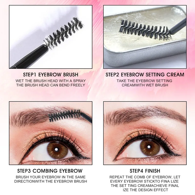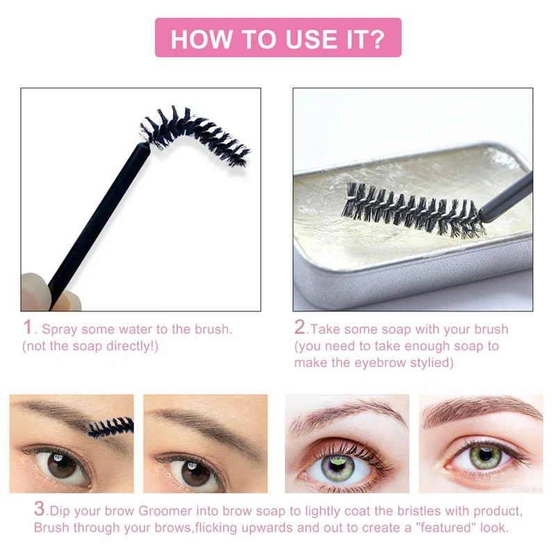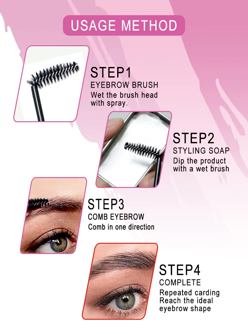1. Распылите головку кисти распылением.2. Почистите мыло для бровей слегка влажной щеткой (количество умеренное, не слишком маленькое, не слишком большое, чтобы не прилипать)3. Повторите расчесывание бровей и позвольте каждому карандаш для бровей установить мыло для достижения эффекта настройки.