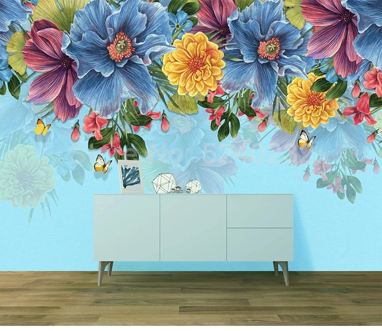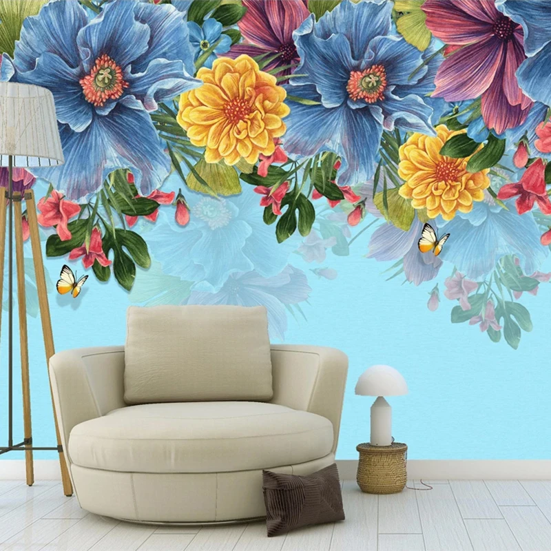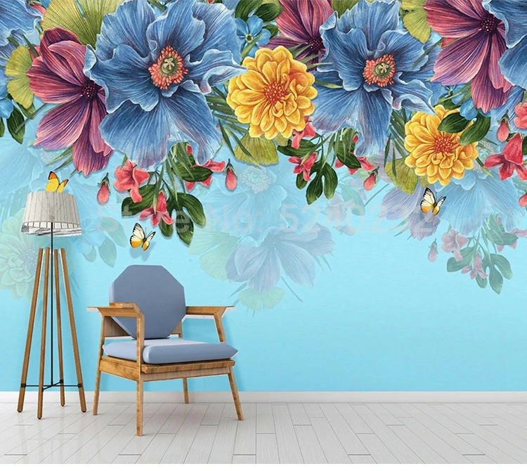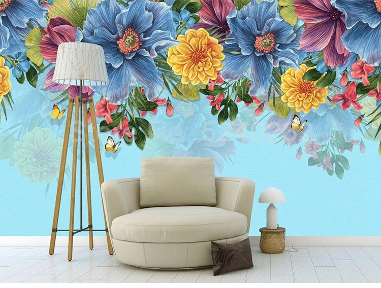 Фотообои 3D Ручная роспись в стиле ретро, фотообои для гостиной, спальни, синие цветы, водонепроницаемая Картина на холсте