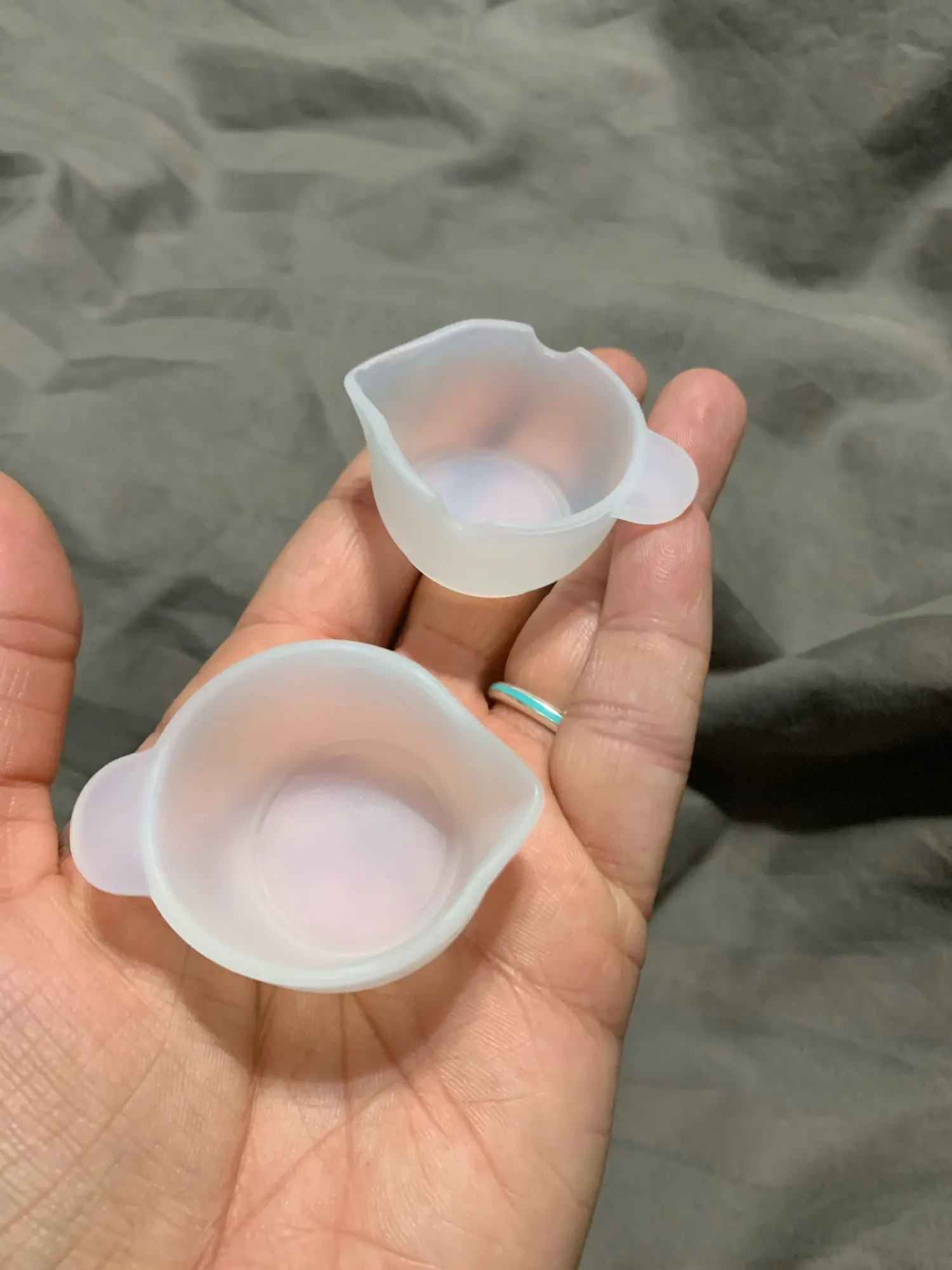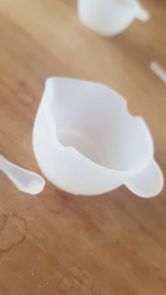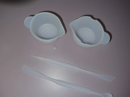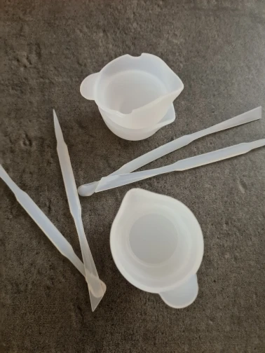 Внимание, это маленькие чашки! Отлично подходит для небольшого количества смолы. Я использовал их для колец или подвесок. Перемешивание инструментов бесполезно, слишком мягко. Одна из чашек имеет две выемки для отдыха вашего ребенка, это умно. В целом я доволен своей покупкой.
