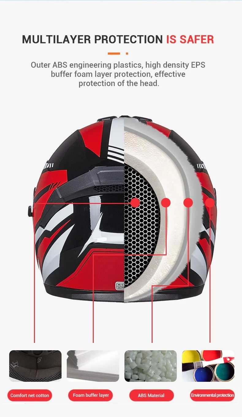 Высокопрочный корпус из АБС-пластика, легкий и ударопрочныйГладкий и легкий дизайн уменьшает шум ветраМногослойный буферный слой EPS обеспечивает современное поглощение энергии.Комфортная мягкая подкладка из дышащей технической ткани, гипоаллергенная, высококачественная ткань, мягкая, впитывающая, вентиляция, лучшая гибкость; Больше чистотыДизайн откидных линз обеспечивает защиту от ультрафиолетаВпускные и Выхлопные порты обеспечивают большую вентиляцию, чтобы держать вас в прохладеБЫСТРОРАЗЪЕМНАЯ Пряжка для надежной фиксации, которая останется на вашей головеЕвропейский дизайн, передний Носок, верх и хвост, делают шлем более моднымРазумный Дизайн: подарите вам удовольствие от поездки