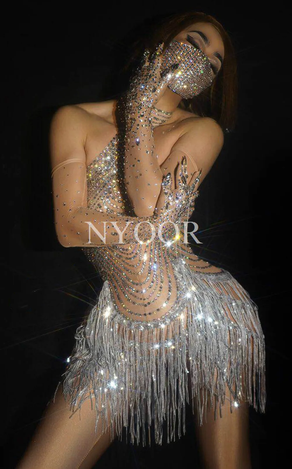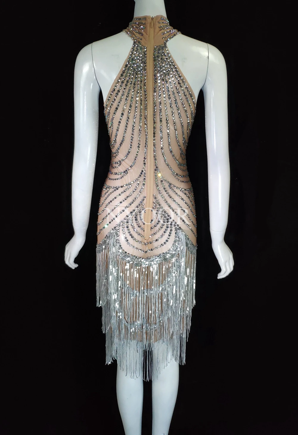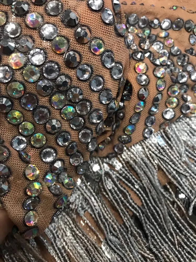 Блестящие стразы с кисточками танцевальный костюм сексуальный женский с эластичной сеткой Прозрачное платье певица танцор сценическая одежда