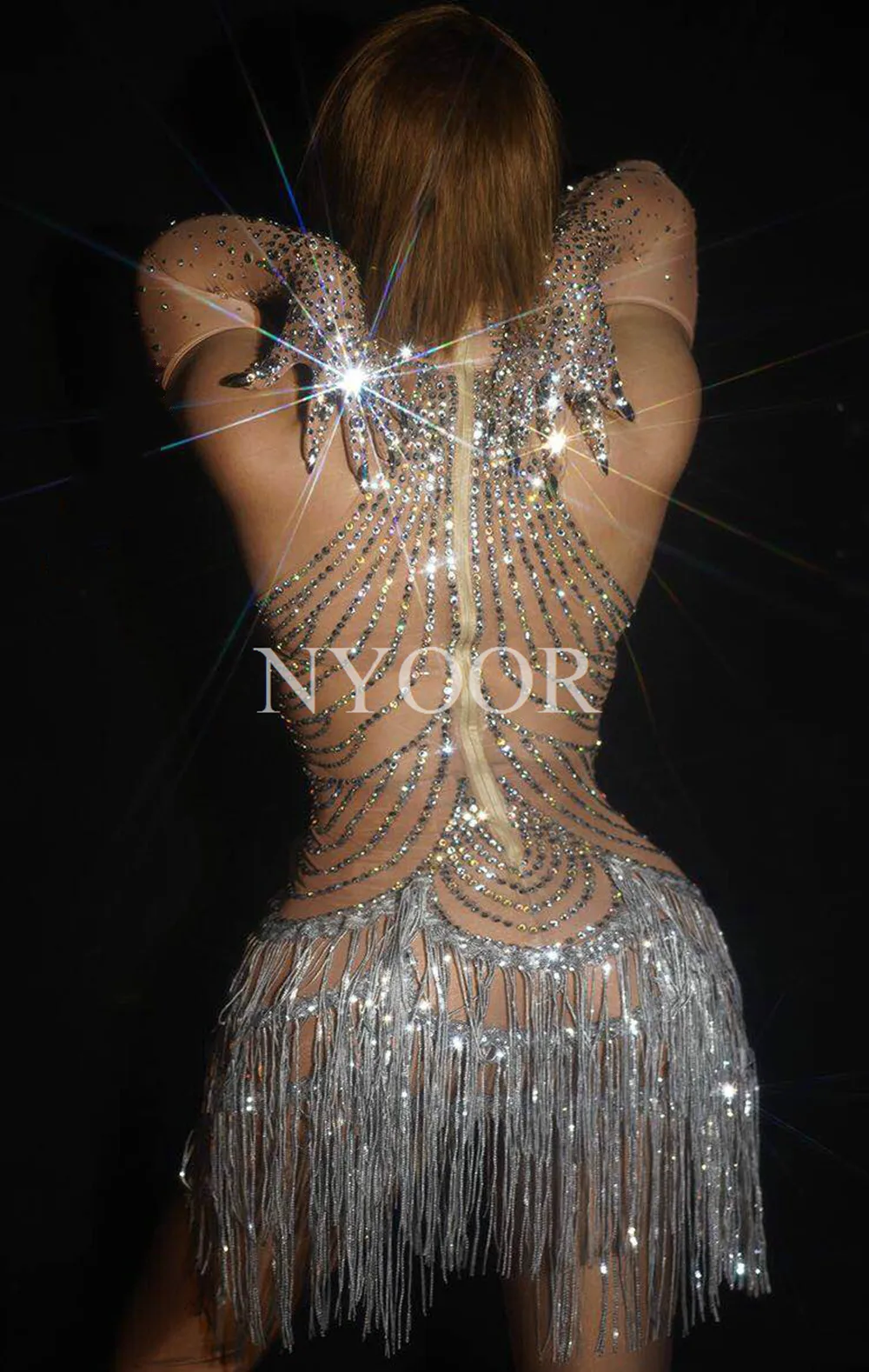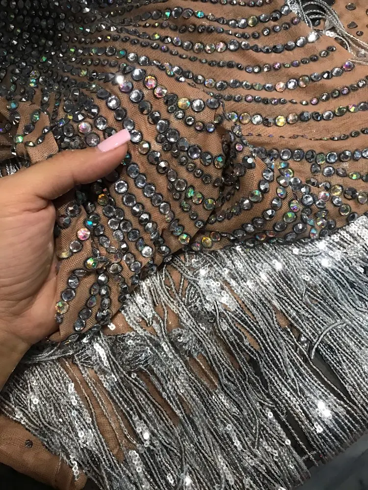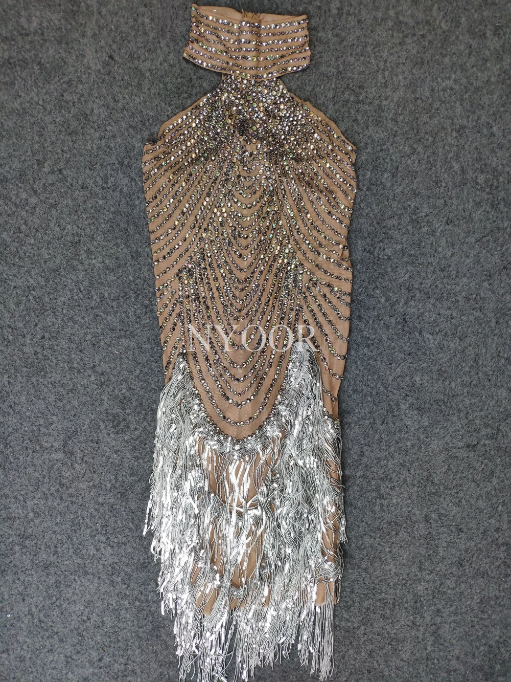 Блестящие стразы с кисточками танцевальный костюм сексуальный женский с эластичной сеткой Прозрачное платье певица танцор сценическая одежда