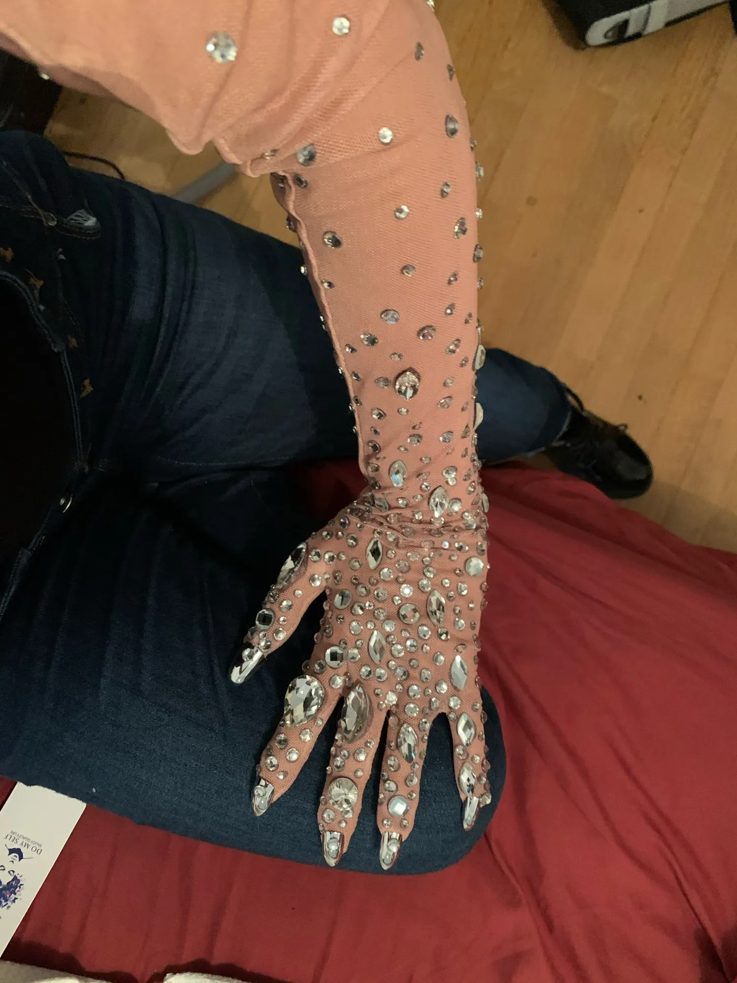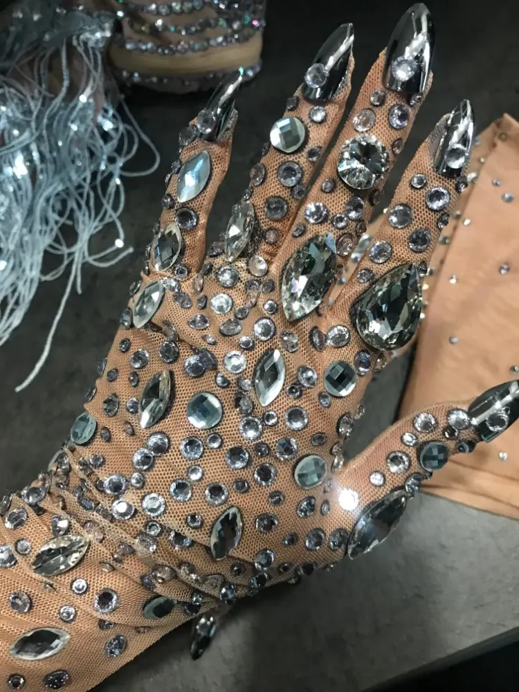 Очень довольна! Оказалось даже лучше, чем я думала! Стразы и камни прекрасно блестят и их очень очень много! Смотрится отлично, заказала и платье и перчатки. Минусы: ткань очень тонкая и не эластичная, нужно подшивать. Растягивается и болтается горловина платья и рукав перчаток. Немного криво приклеены ногти на перчатках, но не критично. Заказала 18 сентября. Пришло 13 октября. В общем, я рекомендую!!