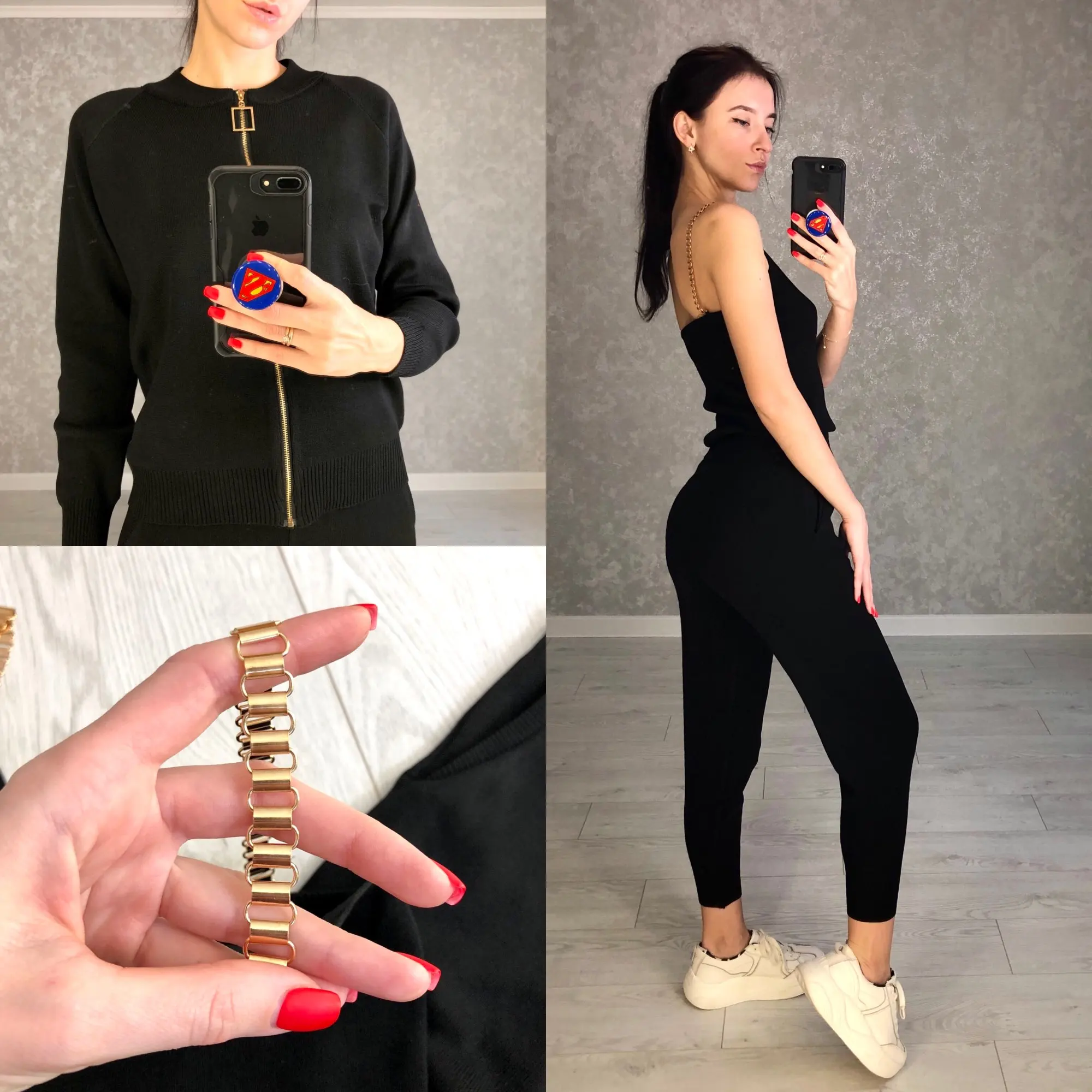 Мой instagram @juliakhara Костюм тройка. Брюки, топ на красивых металических бретелях золотистого цвета и кардиган. Золотая фурнитура смотрится очень красиво На мои параметры: рост 162 и 84-64-90 сел хорошо. Достаточно свободно, но не болтается. Мне нравится заправлять топ в брюки. Брюки с завышенной талией, карманами и резинкой на щиколотке В Москву доставка 2,5 недели. Постороннего запаха нет, сшит аккуратно. Вещь смотрится качественно и стильно! Однозначно рекомендую
