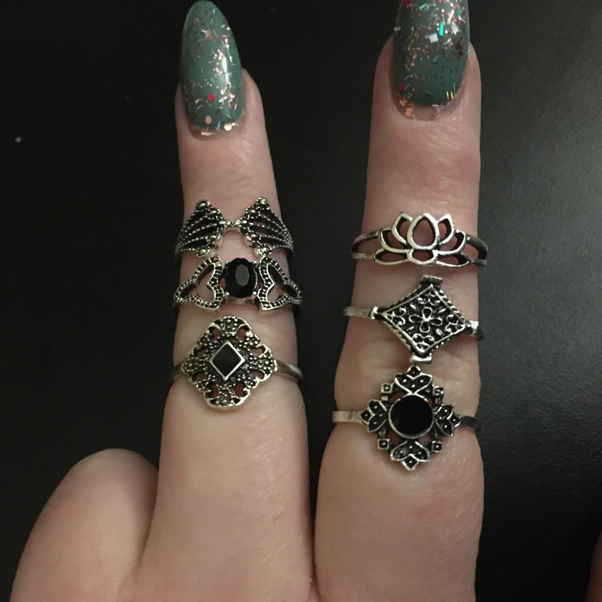 Винтажные серебряные кольца с лотосом для женщин, черные геометрические стразы, цветок на костяшки Миди, ювелирные изделия, 10 шт.компл.