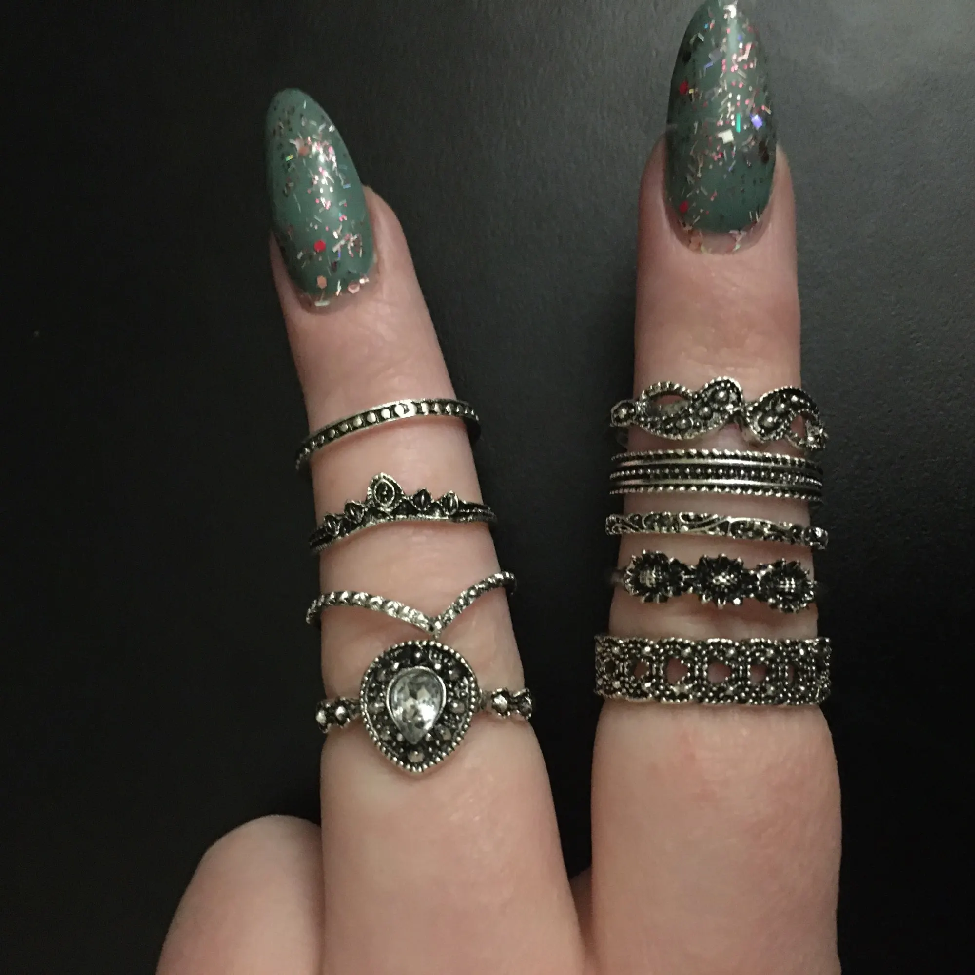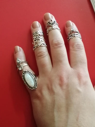 Кольца точно такие же, как на фото, очень красивые. Они окислены .. Таким образом, они оставили серые пятна на пальцах, но после чистки они выглядят блестящими и красивыми. Доставка занимает некоторое время, но это можно понять из-за пандемии.