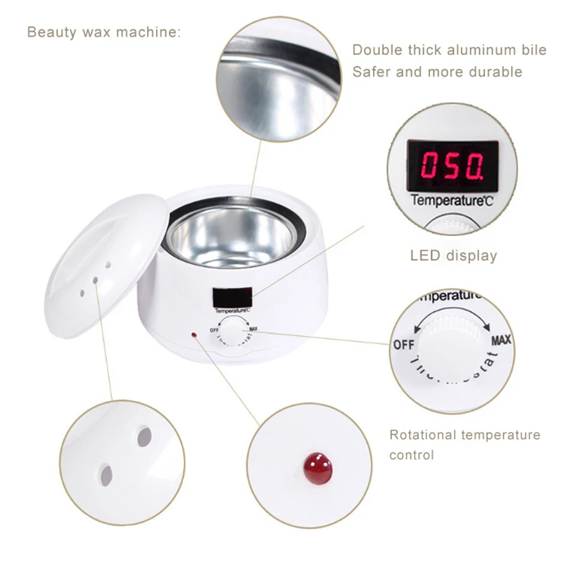 【Размер 】 диаметр 18 см * высота 15 см 【Capacity】 500cc 【Мощность 】 80 Вт 【Voltage】 110V/220V Особенности: 1. Абс пластиковый корпус, высокая термостойкость, низкая термостойкость и сопротивление столкновению. 2. Светодиодный дисплей показывает температуру, температура в реальном времени ясна с первого взгляда, сколько градусов нагреваться, а максимальная температура достигает 135 градусов Цельсия. 3. Высококачественная подкладка из алюминиевого сплава с ручкой, которая может использоваться после нагрева, что является безопасным, легким и не жарким. 4. Ручка проста в эксплуатации. Поверните ручку вправо, чтобы включить переключатель, и продолжайте вращать вправо, чтобы отрегулировать температуру восковой машины.