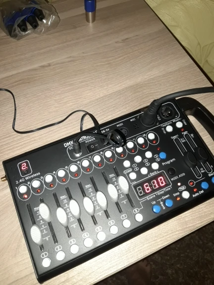 Заказ был разбит на две посылки, первая сам контроллер, вторая 6 адаптеров DMX WIFI; вторая пришла с задержкой дня в три. Качество контроллера хорошее, слегка заедает 8 фэйдер, инструкция на английском. Адаптеры хорошего качества.