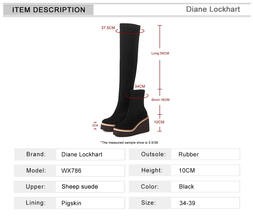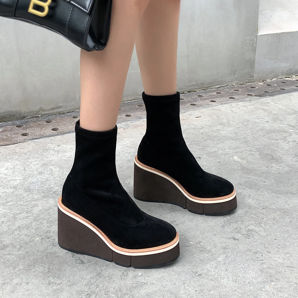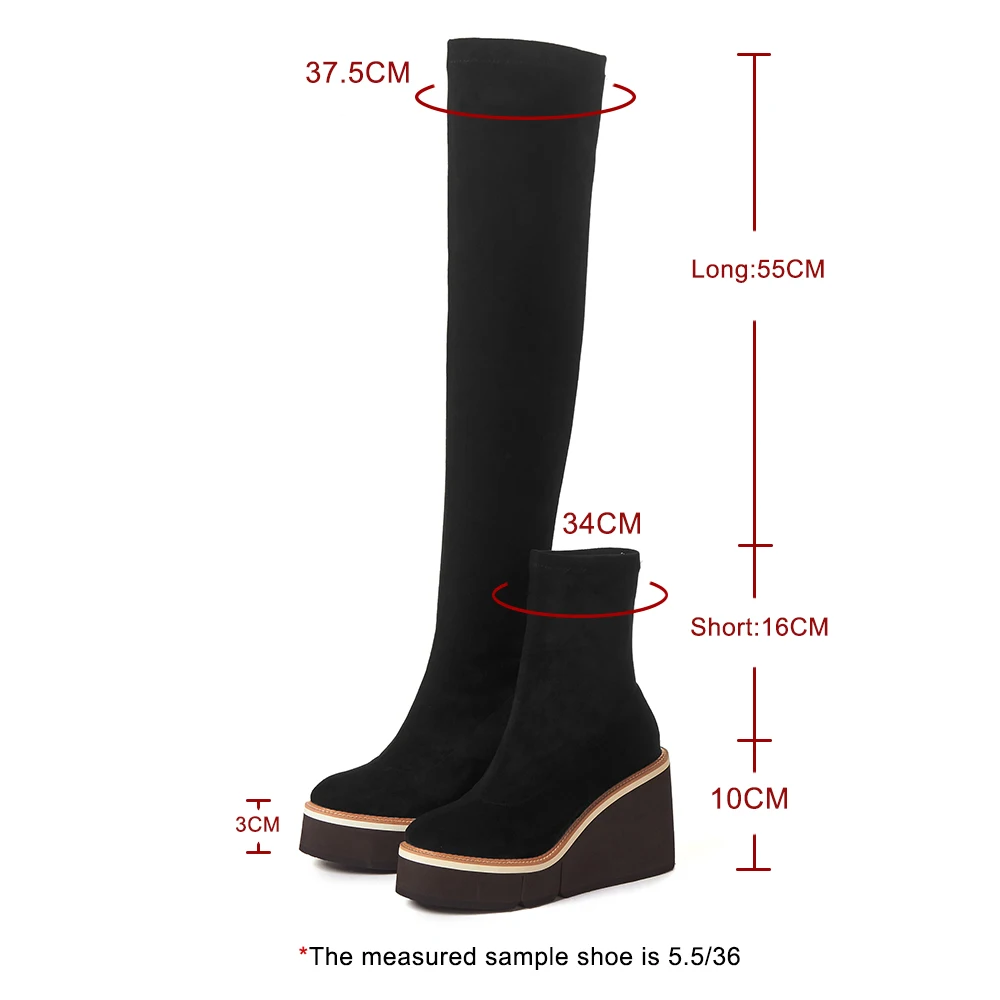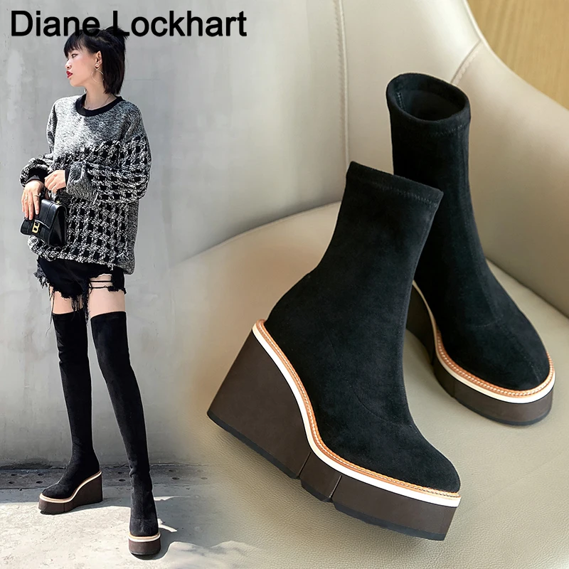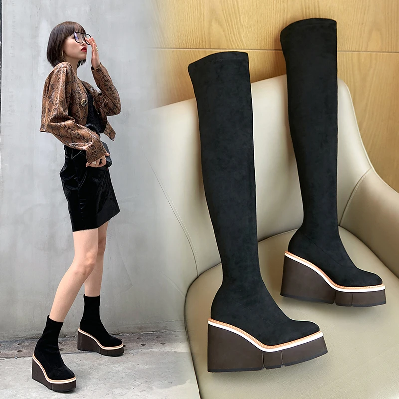 2021 Сапоги выше колена зимние женские сапоги на танкетке, высокий каблук, без застежки, из эластичного флока, мотоциклетные сапоги на платформе Botas Mujer