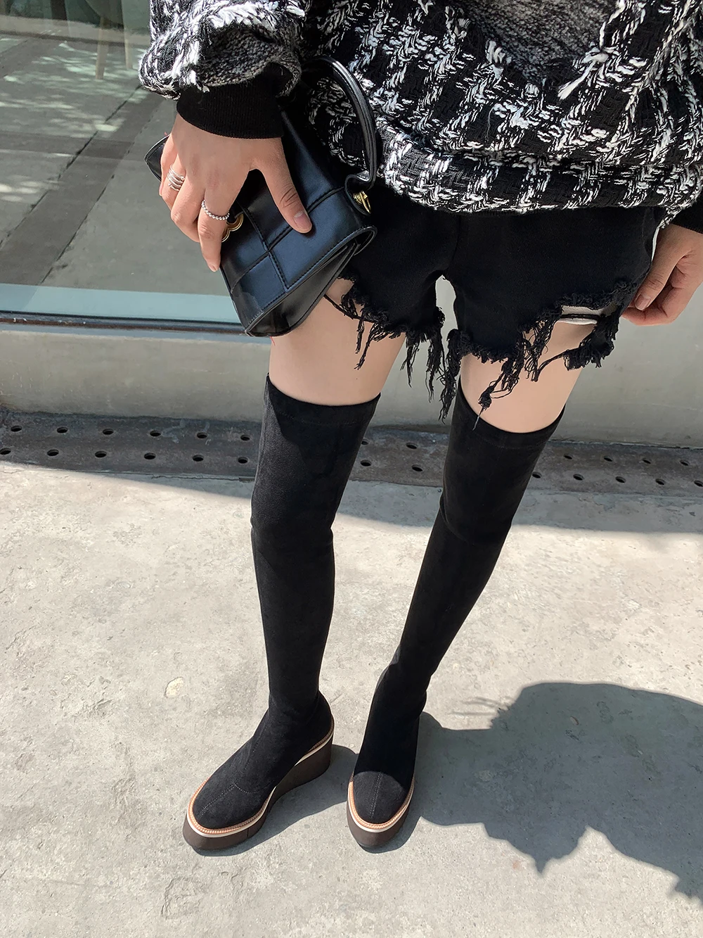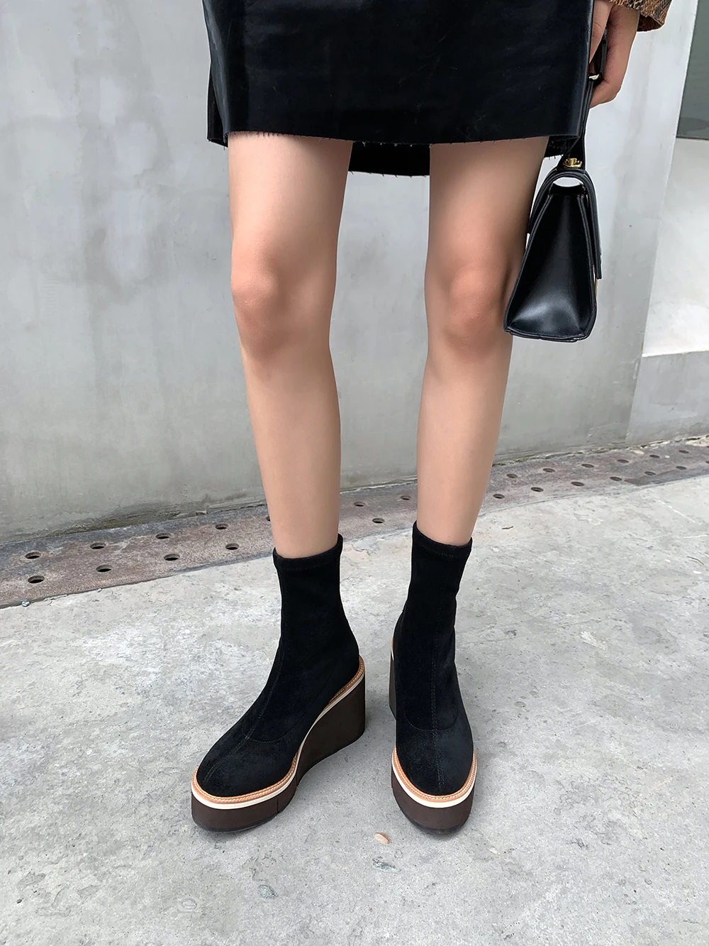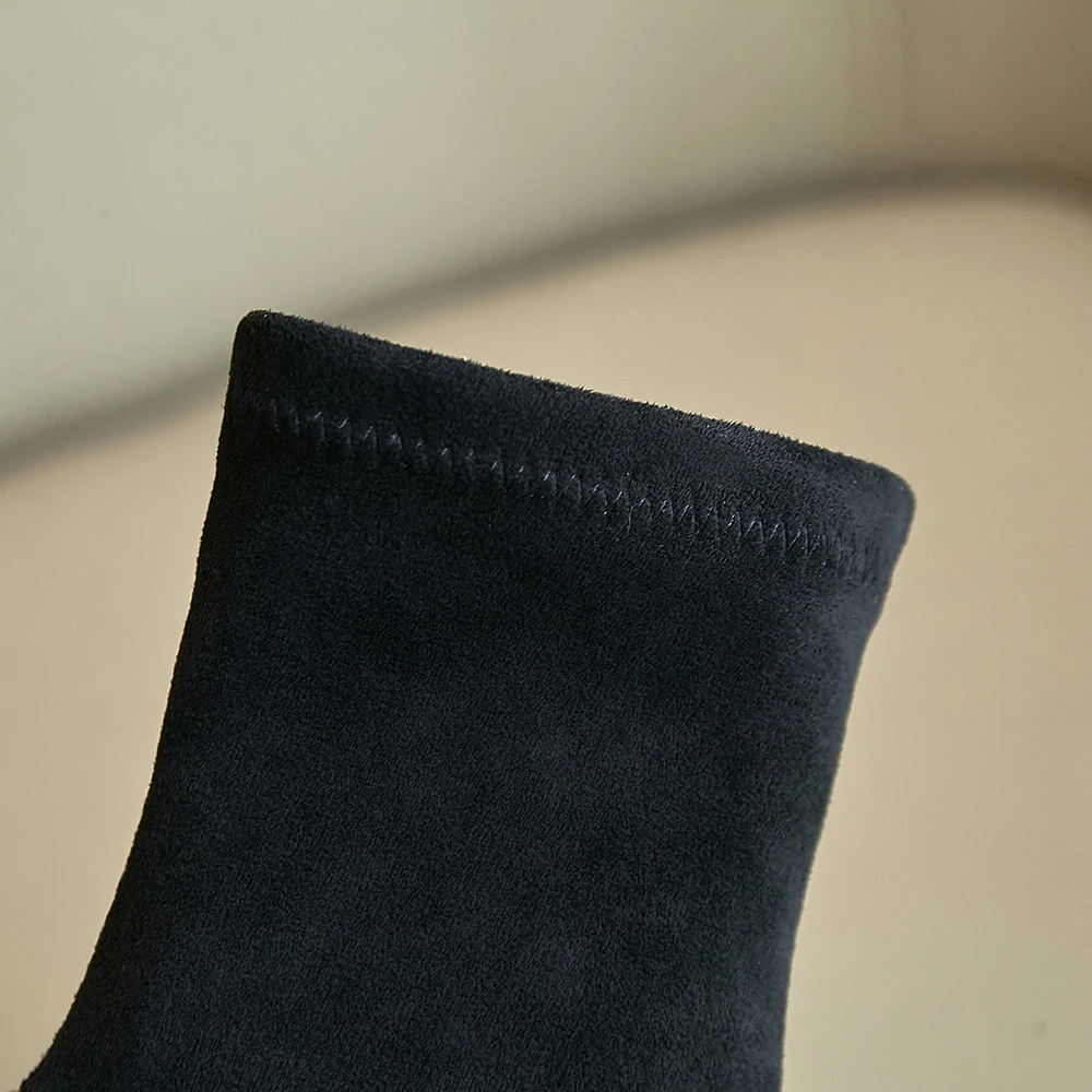 2021 Сапоги выше колена зимние женские сапоги на танкетке, высокий каблук, без застежки, из эластичного флока, мотоциклетные сапоги на платформе Botas Mujer