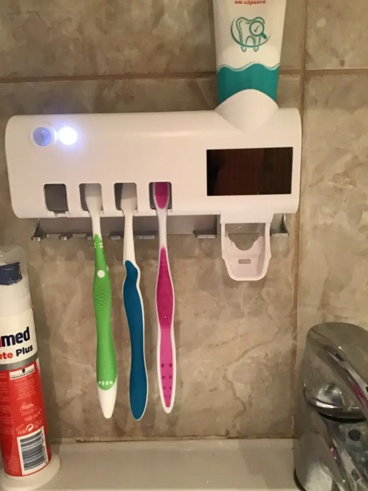 Классная штука, рекомендую. Купил сперва одиночную только под пасту, ребёнок то же захотел такое, а у неё паста другая - детская, вот купил такую ещё и для щёток есть место. Не знаю насколько качественно дезинфецируются щётки, но мне кажется лучше так чем они стоят в стаканах, которые я сразу выкинул нафиг. Пришло быстро до Москвы.
