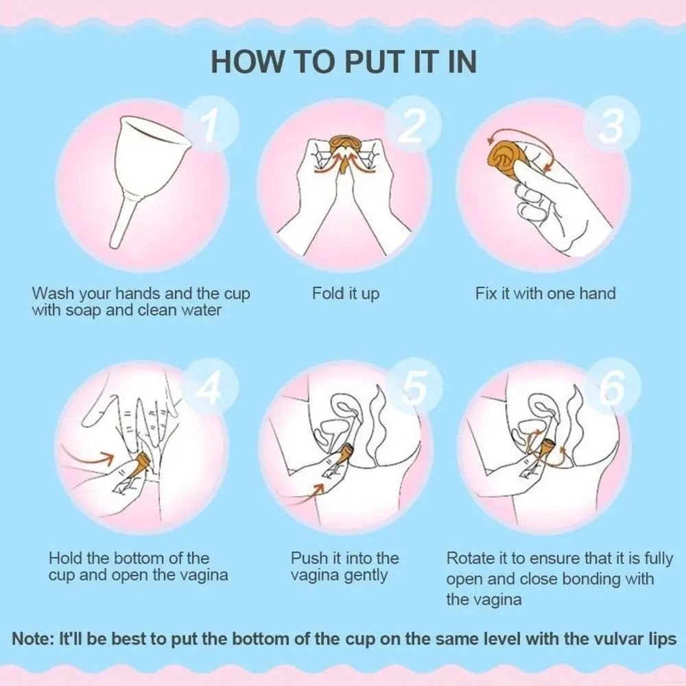 1. Перед обработкой менструальной чашки убедитесь, что ваши руки тщательно чистятся.2. Стерилизовать чашку перед первой вставкой.3. Рекомендуется вставлять чашку в любое из следующих позиций: сидя, приседая, опускаясь на колени или стоя, попробуйте одну из этих позиций и выберите наиболее подходящую для вас.4. Чтобы облегчить вставку, вы можете увлажнить чашку водой или смазочным гелем при необходимости.5. Захватите чашку пальцами и нажмите.6. Затем Сложите чашку пополам, используя пальцы другой руки.7. Удерживайте чашку пальцами одной руки в максимально низком положении.8. Аккуратно вставьте чашку во влагалище в сторону спины.9. Правильное положение чашки ниже, чем тампоны. После введения во влагалище отпустите пальцы и дайте чашке полностью разворачиваться и приклеиться к вагинальной стенке.10. Вы можете дезинфицировать до и после использования.