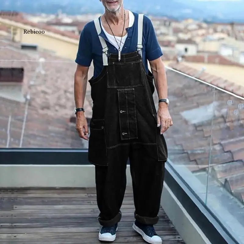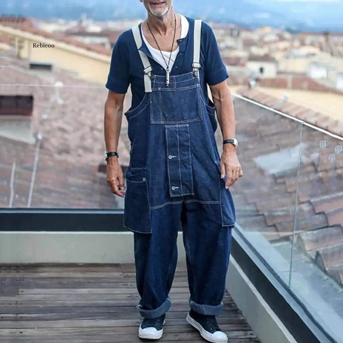 Джинсовый комбинезон мужской с большими карманами, модный мешковатый джинсовый комбинезон с множеством карманов, прямые свободные длинные брюки синего, серого цвета