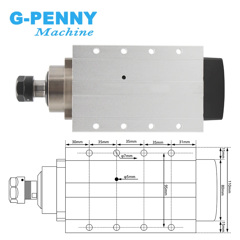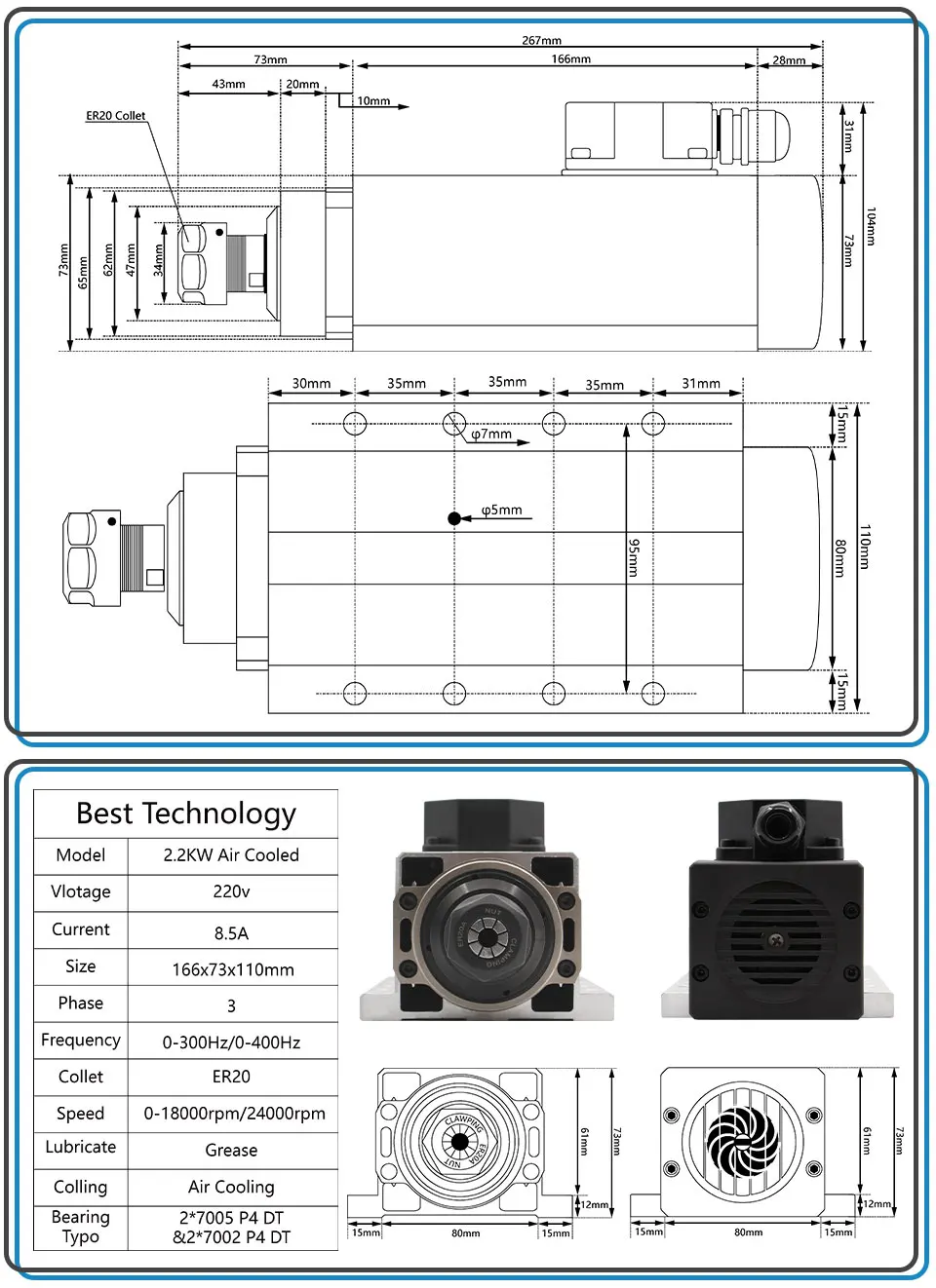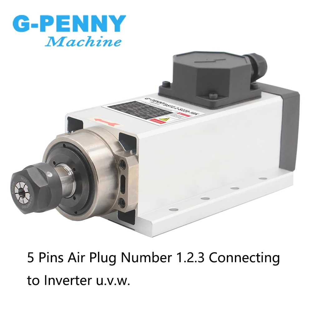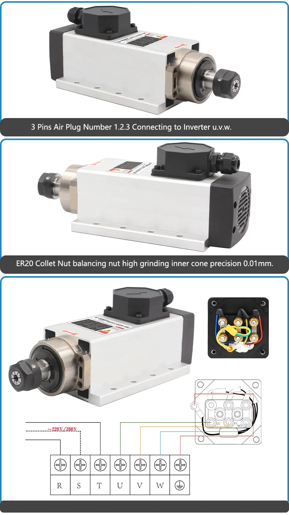 Размер:173x82x95mmс монтажным фланцемСпособы скорости:С помощью 3-х фазный инвертор с одним выходом и настроить преобразователь частоты для того, чтобы изменить скорость вращения шпинделя в режиме реального времени.Охлаждение:Воздушное охлаждениеИнтерфейс питания:Дополнительно 5 контактов Водонепроницаемая воздушная вилка. Воздушная вилка отмечена «1», «2», «3», «4», «5», «GND». «1», «2», «3» были подключены к инвертору (U, V, W), «GND», подключенному инвертору.(Обратите внимание! Наш шпиндель «4» подключается к GND, обещает персональную безопасность!)Мощность:2 кВт (1 л.с. = 0735 кВт)Напряжение:220vТок:8.5AЧастота:0-300 Гц/0-400 ГцСкорость:0-18000 об/мин/0-24000 об/мин (если вы выбираете керамические шариковые подшипники, скорость может быть 24000 об/мин)Выход:Меньше, чем 0,01 ммТип подшипника:2x7005 C P4 DT и 2x7002 C P4 DTКоллет:ER20Диаметр Зажима:1 мм, 2 мм, 3 мм, 3,175 мм (1/8),4 мм, 5 мм, 6 мм, 6,35 мм (1/4),7 мм, 8 мм, 9 мм, 10 мм, 11 мм, 12 мм, 12,7 мм (1/2),13 ммСмазка для смазкиОсновное применение:Гравировка для дерева, бамбука, обычной печатной платы, ПВХ, ПММА, пластика, duotone платы (ABS) и т. Д. Неметалла, также может гравировать на золото, серебро, медь, алюминий, pb и т. Д. Мягкая металлическая поверхность.(Пожалуйста, обратите больше внимания, это деревянный Рабочий шпиндель, может использоваться только для обработки древесины и работы алюминия, пожалуйста, не используйте его для стали. Если вам нужна стальная работа, пожалуйста, проверьте металлический шпиндель, спасибо!)