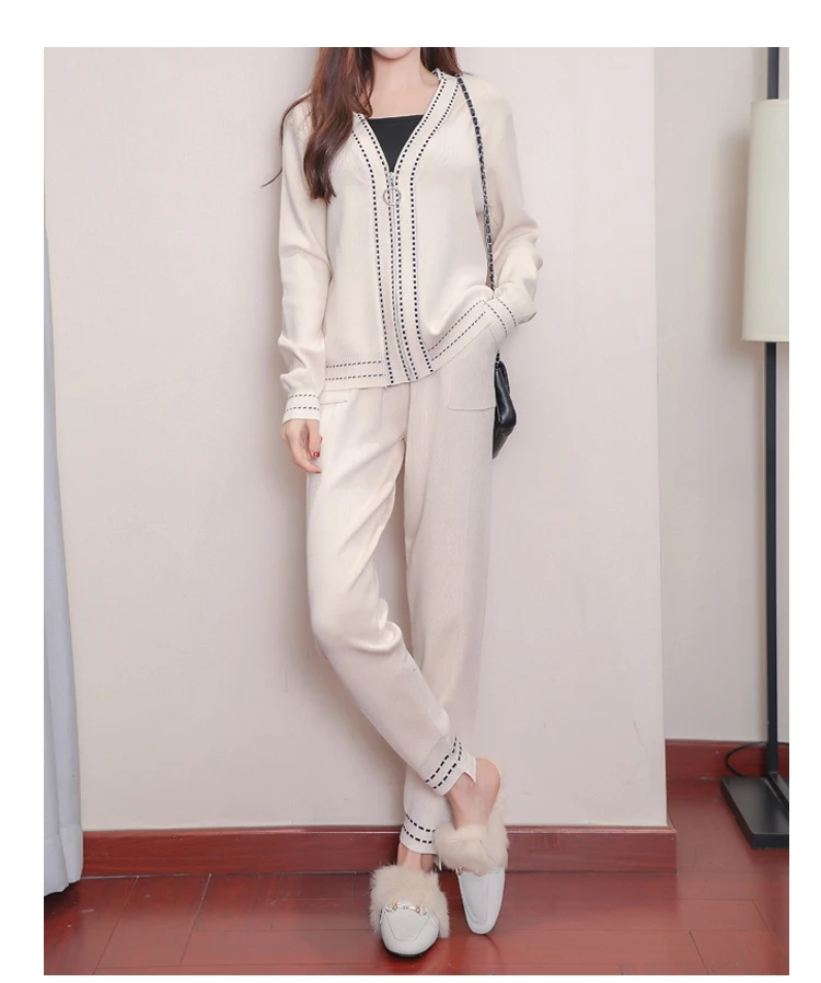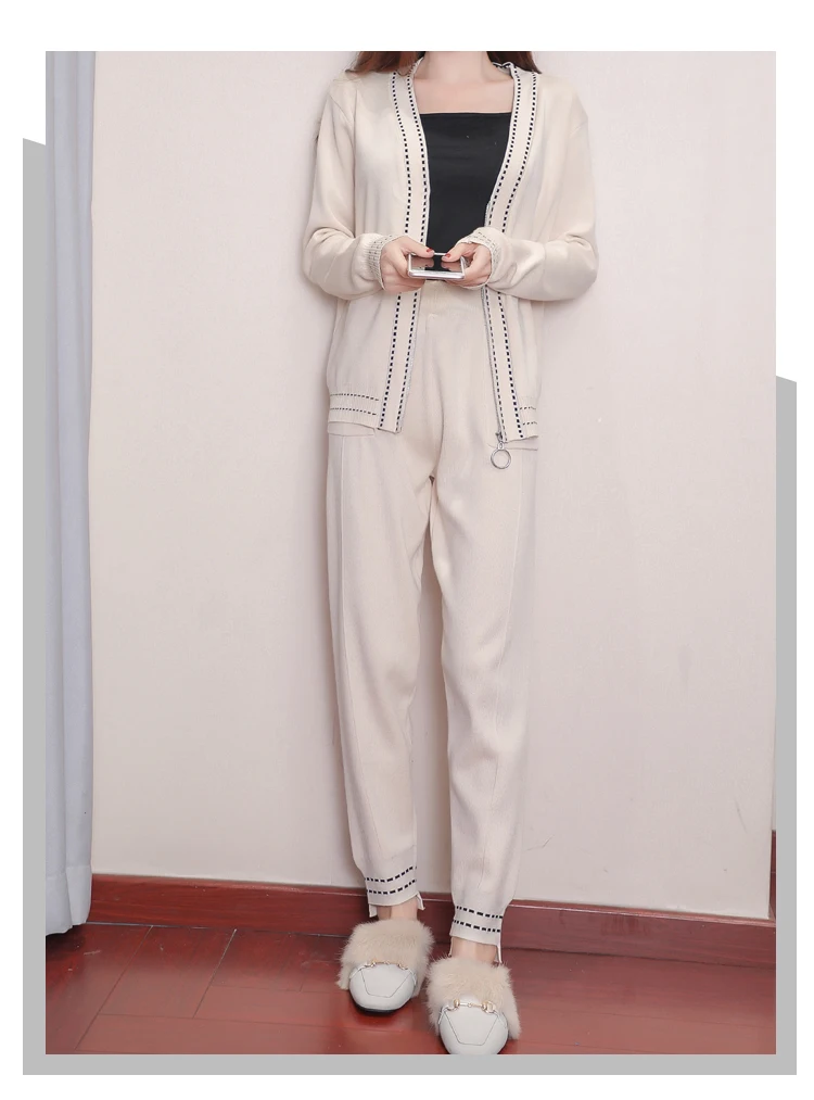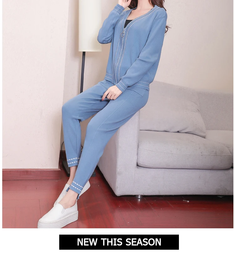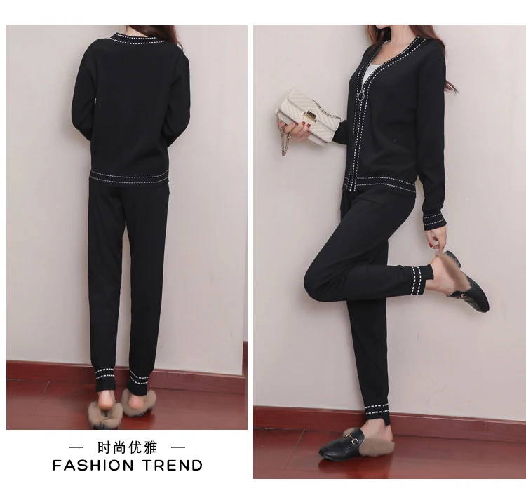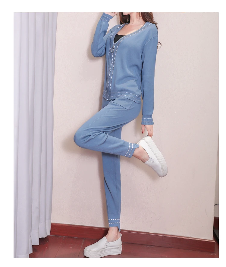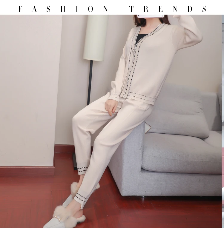 Женский Повседневный Спортивный костюм, Трикотажный костюм из двух предметов, кофта на молнии с V-образным вырезом и длинные брюки, осень 2020