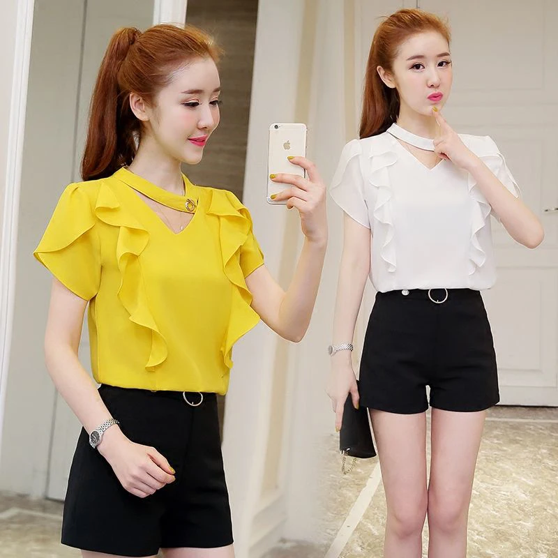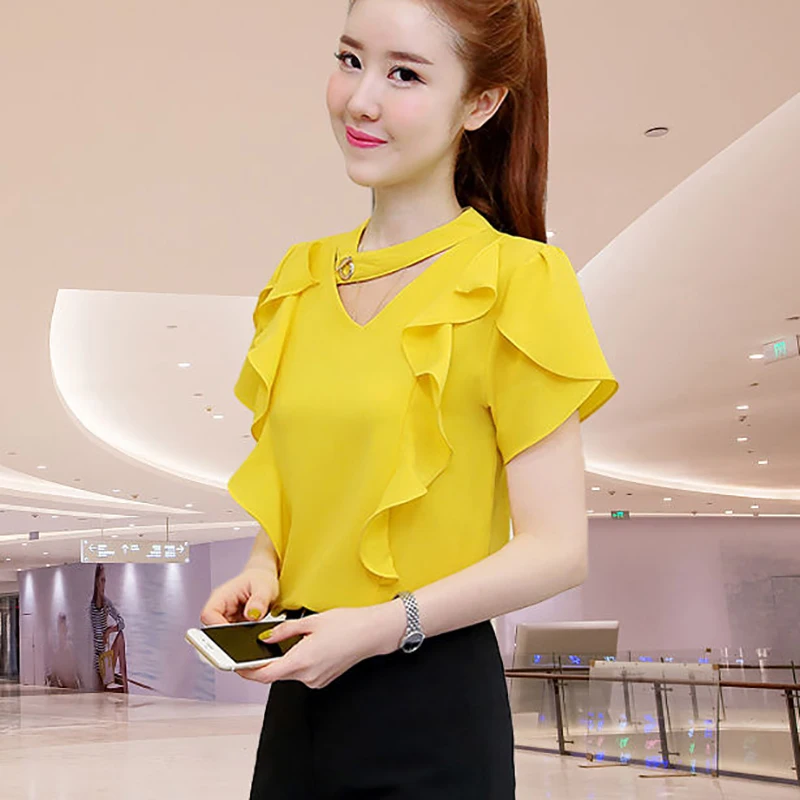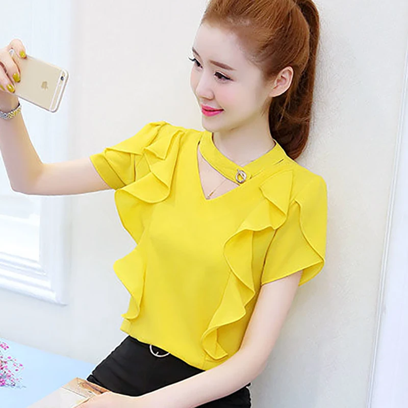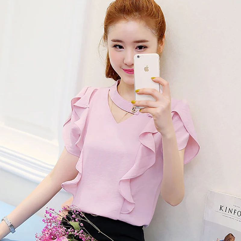 Женские весенне-летние стильные шифоновые Женские Блузки Рубашки повседневные шифоновые Блузы с V-образным вырезом и оборками DD8872