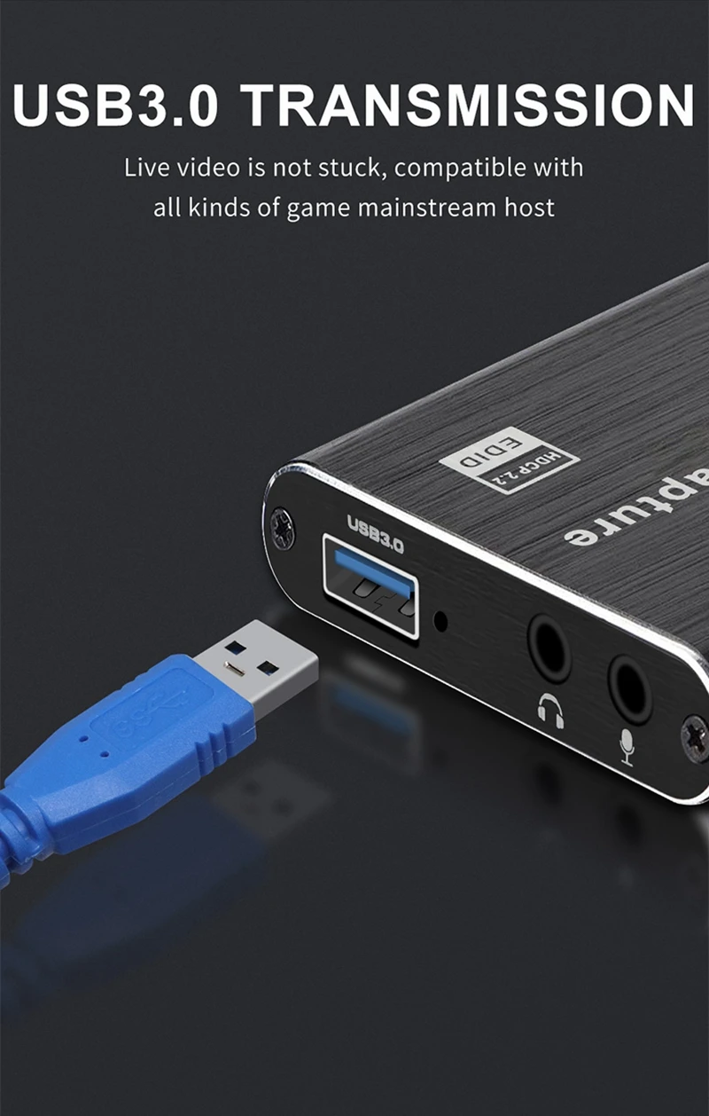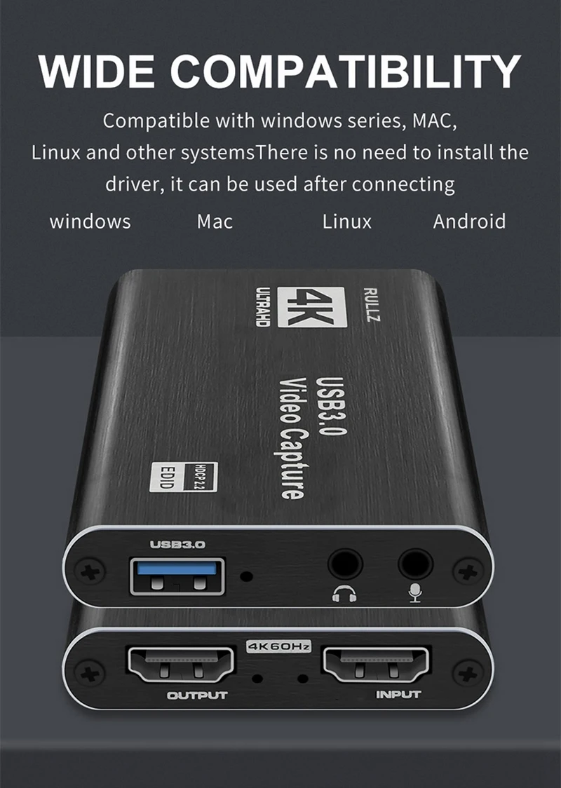 И простая установка, Он может поддерживать Макс. HD 4k 60 вход и запись 1080P 60; Совместим с Windows,Linux,Macos XПорт USB3.0 и задняя часть совместимы с портом USB 2,0, поддержка порта видеоЗапись, запись, прямая трансляция через ряд программного обеспечения для 3rd-party;Запись видео в формате HD соответствует стандарту UVC и UAC.
