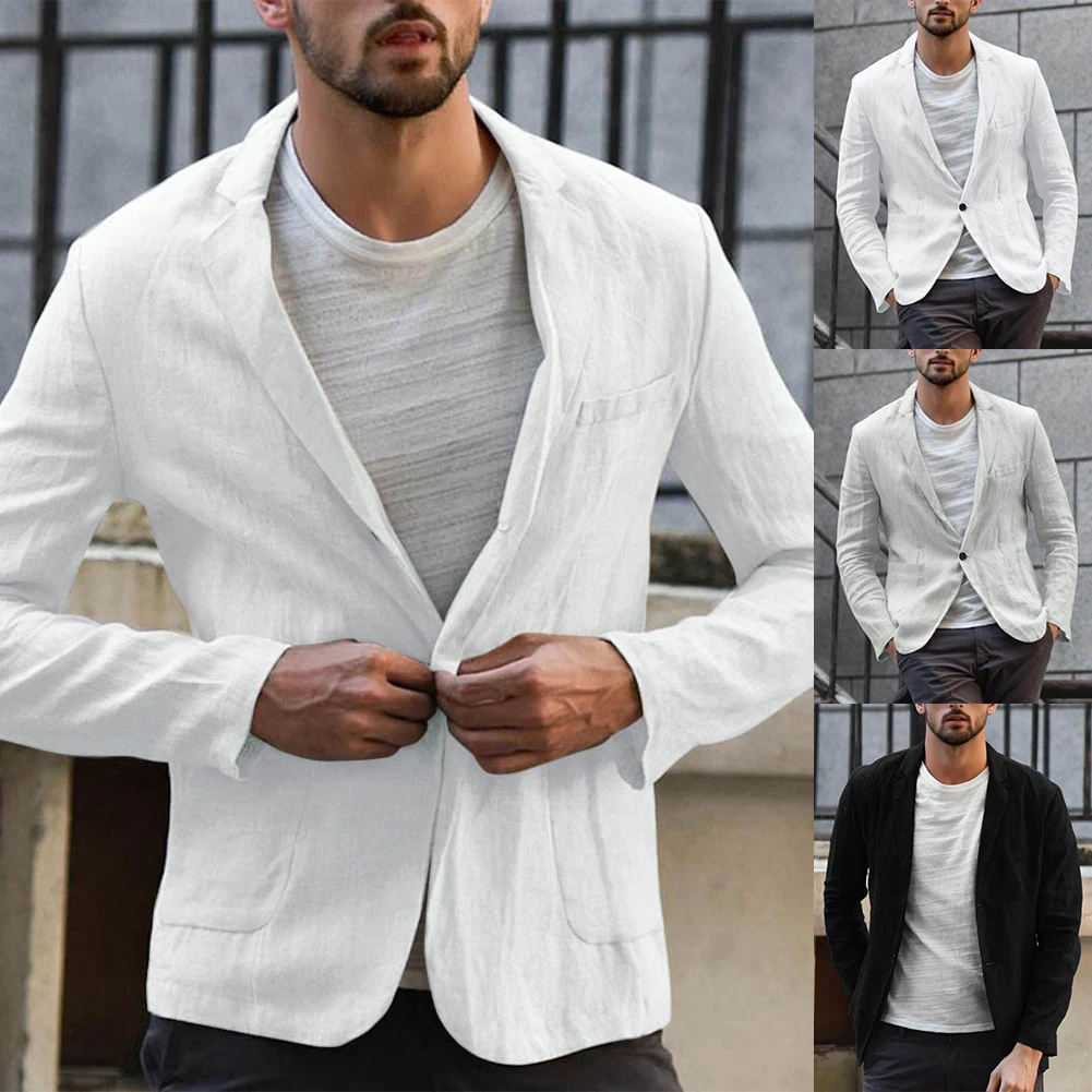 Осенние мужские блейзеры из хлопка и льна, блейзеры с длинным рукавом для мужчин, куртка, блейзер с карманами на одной пуговице, женская одежда