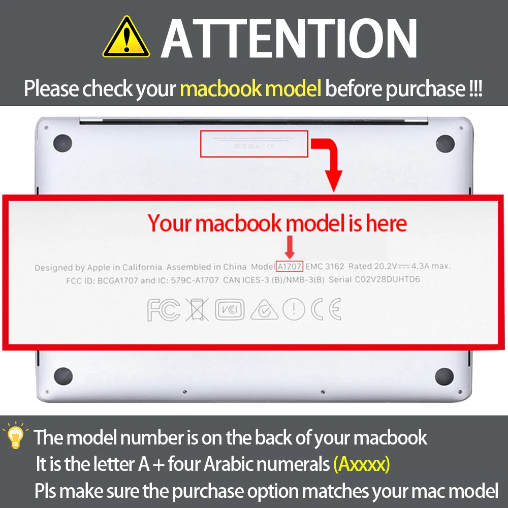 Внимание, пожалуйста:Пожалуйста, проверьте нижнюю часть вашего Macbook перед покупкой, вы увидите слова"Модель Axxxx","Axxxx"Это ваша модель Macbook, если вы не уверены в модели, пожалуйста, свяжитесь с нами, мы поможем вам.
