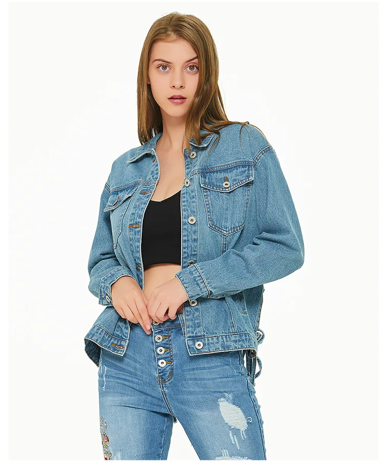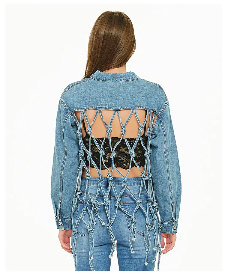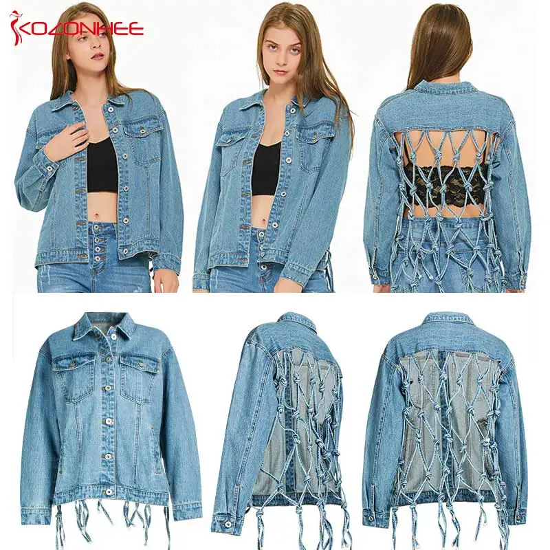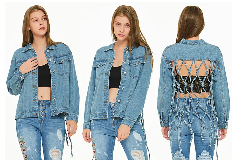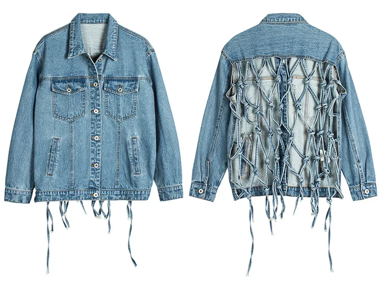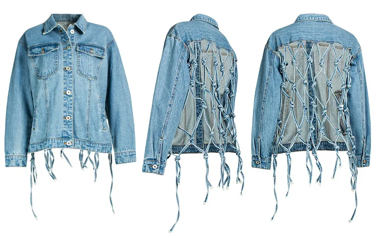 Модное синее неэластичное женское джинсовое пальто, джинсовые пальто, повседневные ажурные карманы, кисточки, женские джинсовые куртки винтажные джинсы, куртка #09