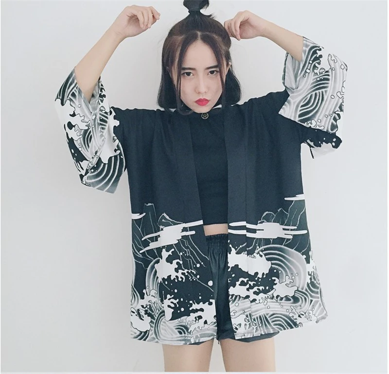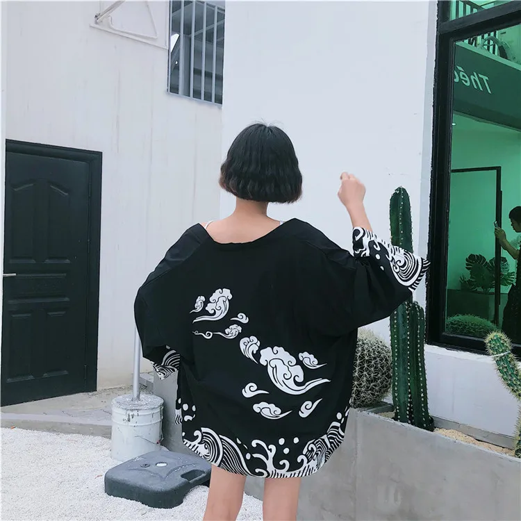 HStar японский стиль Японский рукав летучая мышь кимоно принт Винтаж Harajuku стиль блузка волны и ветер рубашки с драконом