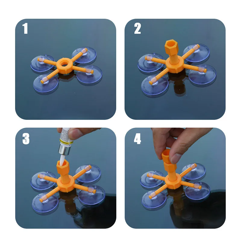 2. Этот набор должен использоваться только для быков-глаз, паутины, повреждений звезд, а некоторые комбинации ломаются меньше, чем 1 дюйм (25 мм) в диаметре. Этот комплект не будет восстанавливать поверхностные ямы больше или трещин длиннее 3/16 дюймов (5 мм).