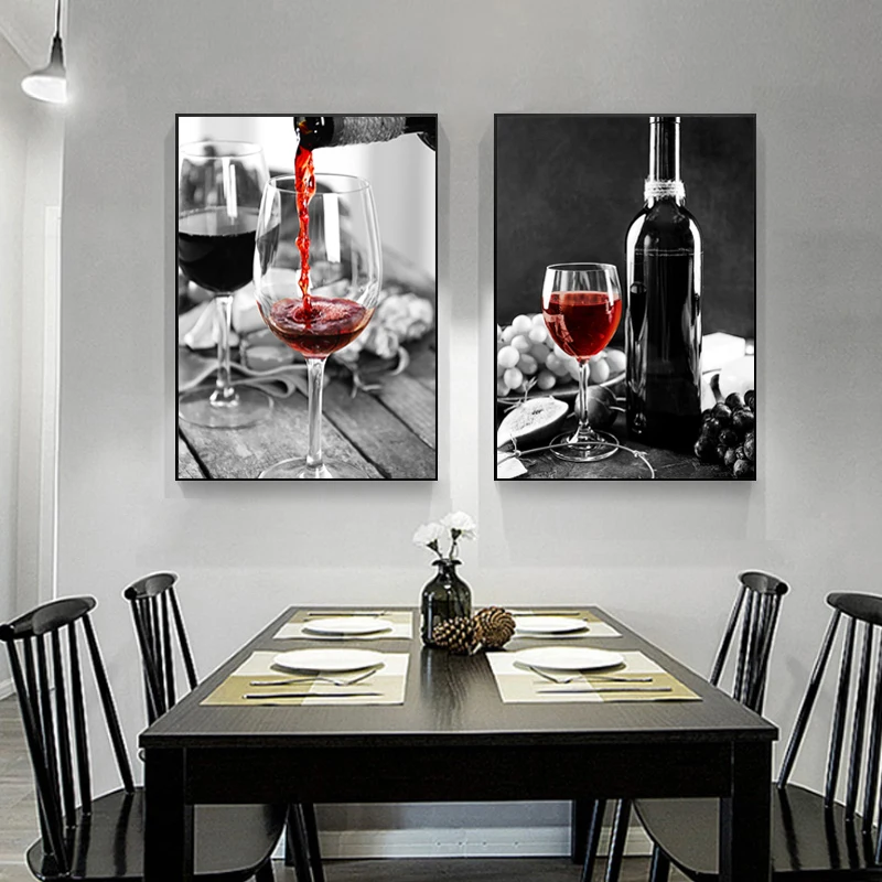 Красное вино и бутылка кухонный плакат черный белый напиток еда холст печать HD настенная живопись картина столовая Ресторан Декор