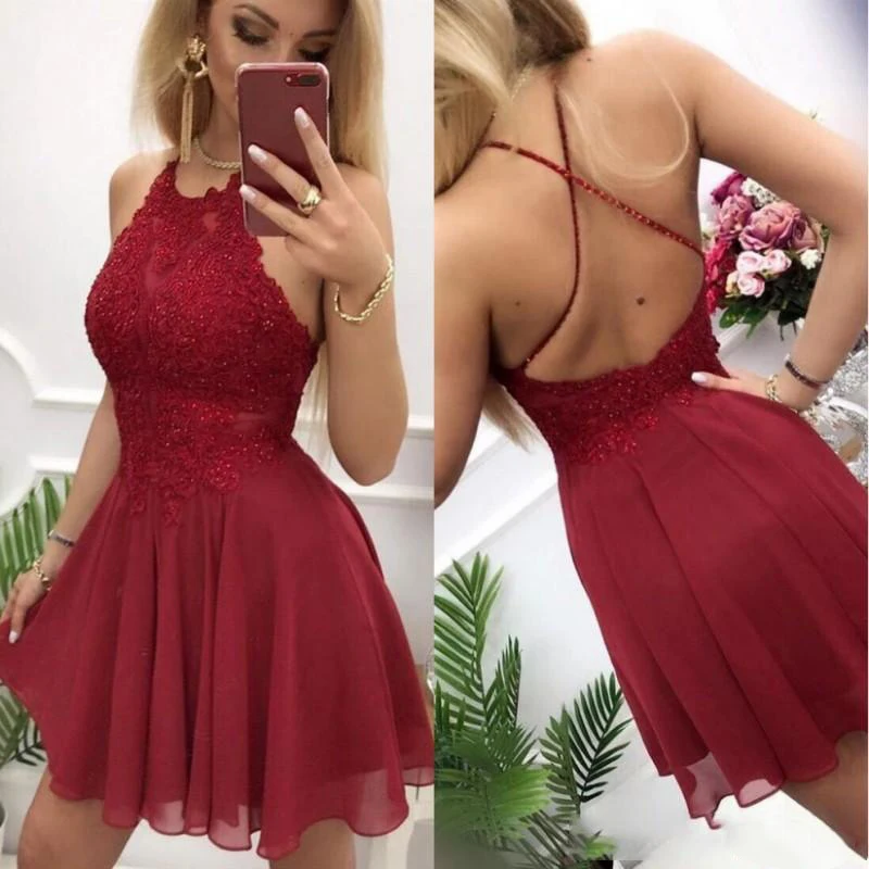Шикарные мини-платья для встречи выпускников с лямкой на шее, бордовое кружевное короткое платье на бретельках с бусинами для выпускного вечера, шифоновая юбка, коктейльные платья с открытой спиной